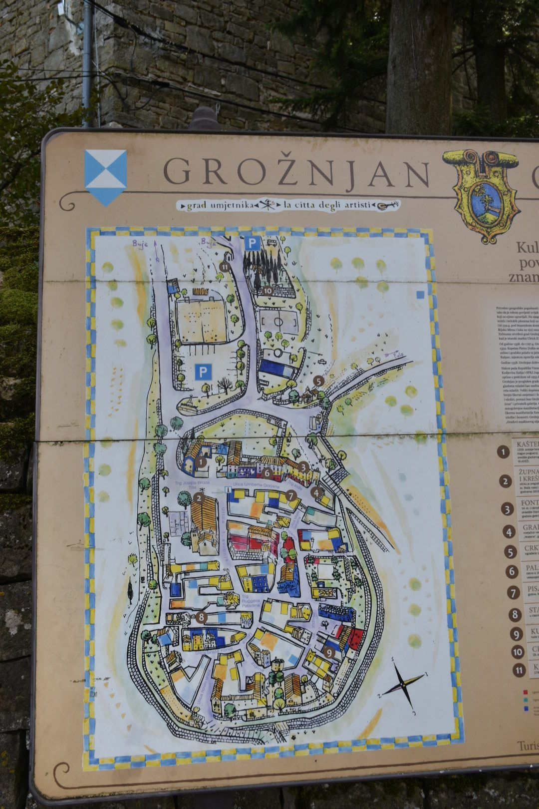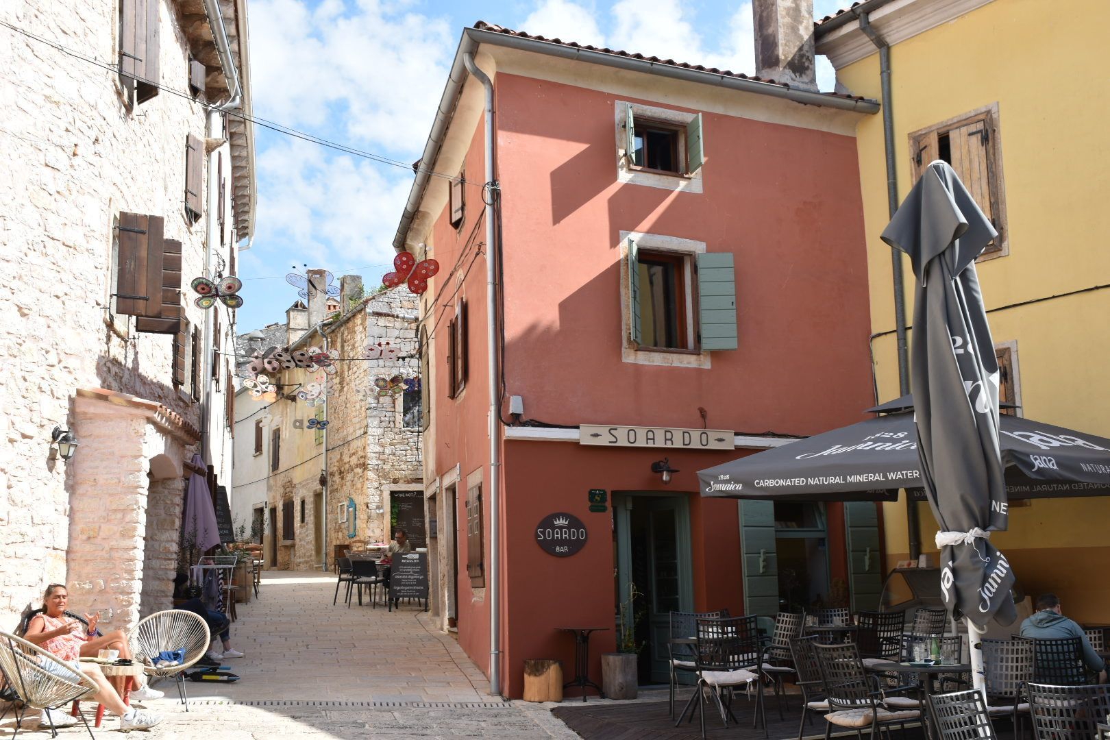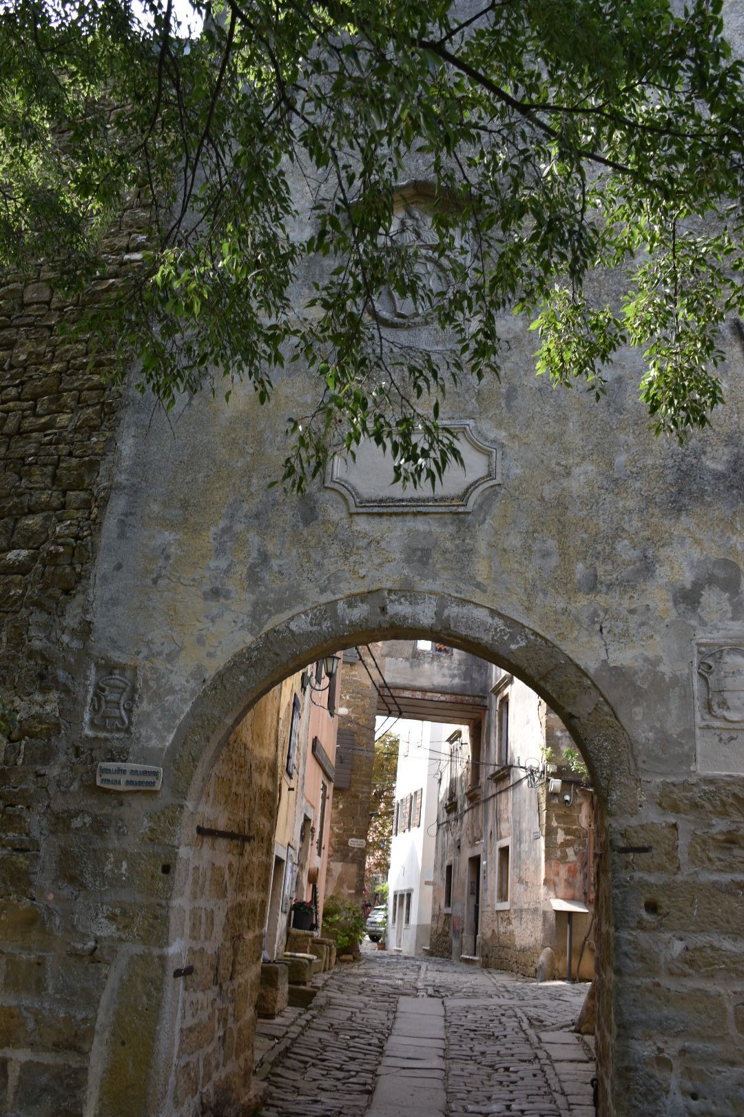Erstes Ziel sollte wieder Groznjan sein (Wiederholungstäter 😏), das früher verfallene Dorf, das durch Künstler wieder aufgebaut wurde. Wir waren diesmal 2 Stunden später dran als im letzten Jahr. Diesmal war es recht gut besucht und alle Restaurants waren ebenfalls geöffnet. Wir haben uns einen Italiener mit tollem Ausblick ausgesucht und auf der Speisekarte stand glutenfreie Pizza. Juliane und ich haben uns eine Pizza und Insalata Caprese bestellt. Juliane fand die Pizza auch gut, sodass beide satt und zufrieden waren.