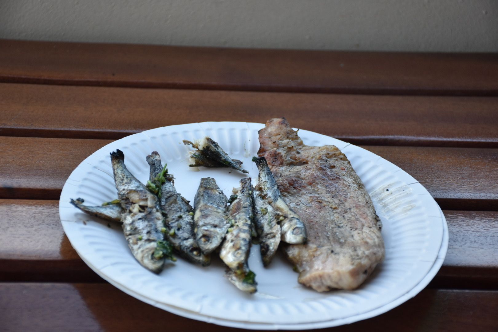 Juliane hat tatsächlich diese kleinen Sardinen komplett ohne Kopf und Schwanz weggefuttert. Ich konnte das nicht und hab Fleisch gegessen.
