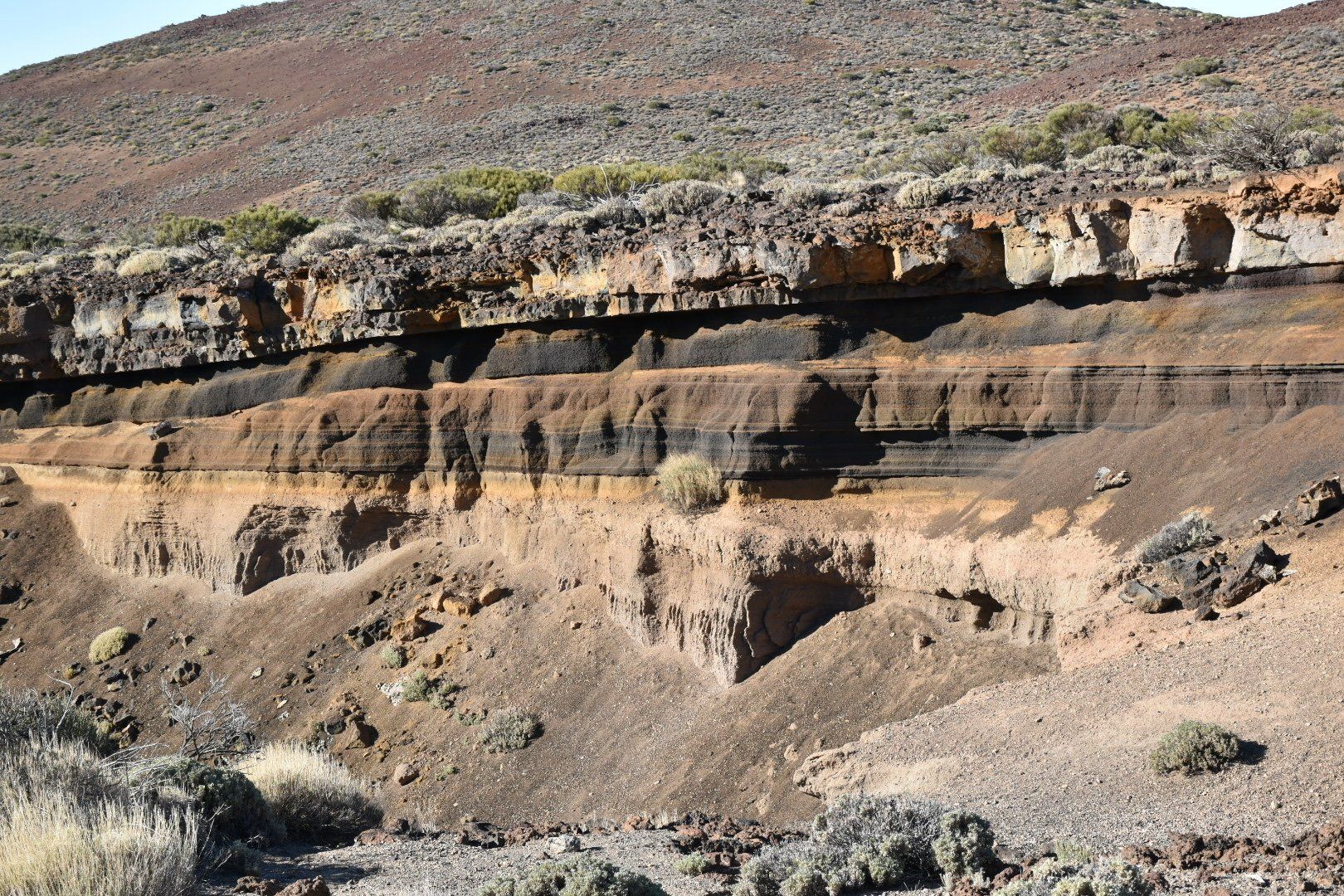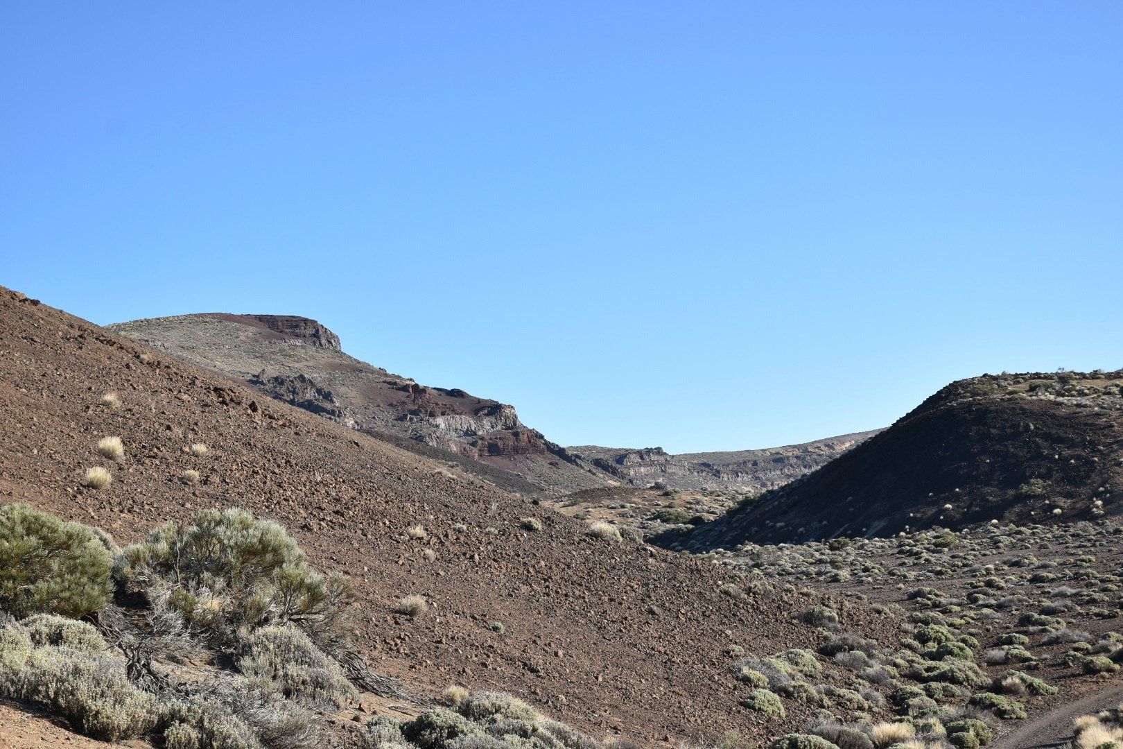 Wir haben uns dann zunächst dem Navi anvertraut um uns zum Startpunkt der Wanderung zu bringen, aber nachdem es uns mehrfach durch kleine steile Straßen führte sind wir dann einfach der TF21 gefolgt an deren Kreuzung mit der TF24 der Start der Wanderung sein sollte. In Puerto de la Cruz schien noch die Sonne bei 22 Grad weiter oben war auf einmal Nebel bei 14 Grad. Wir sind dann durch den Nebel immer weiter hoch durch enge und weite Kurven gefahren und haben uns den Berg erarbeitet. Ab etwa 1.800 Meter war der Nebel auf einmal weg und die Sonne schien wieder. Weiter hoch ging es bis Portillo auf 1.980 Meter. Dort haben wir an einem Restaurant geparkt und unsere heutige Wanderung gestartet. Es sollten etwa 12 Kilometer und 400 Höhenmeter werden, also entspannter als am ersten Tag. Die Runde bestand aus zwei Bergumrundungen, bei denen man oft den Blick auf Teide hatte. Es war toll, durch die roten und die schwarzen Lava-Felder zu wandern bei strahlendem Sonnenschein mit Blick auf den Teide oder die Wolkenschicht unter uns. Ganz anders als die Wanderung gestern, aber auch sehr schön und nicht so anstrengend. Nach etwa 8 Kilometer etwa auf dem höchsten Punkt der Strecke haben wir dann eine kurze Rast gemacht und unser Baguette/Brezel gegessen. Dann folgte der aus meiner Sicht Höhepunkt dieser Tour. Nachdem wir einige Abbruchkanten mit verschiedenfarbigen Ablagerungen passiert hatten ging es in kleinen Serpentinen ein Lavafeld aus schwarzer Asche recht steil den Berg runter. Man konnte den Weg kaum erkennen und es war recht rutschig durch die kleine Körnung der Asche. Man musste schon sehr aufpassen um nicht ins Rutschen zu geraten. Der Rest des Weges ging dann durch ein Tal immer weiter den Berg runter zum Ausgangspunkt der Tour. Dort haben wir gegen 17.00, das Restaurant machte gerade zu, uns noch ein kleines Bier gegönnt. Komisch, aber nach 17.00 geht da oben nix mehr und unser Auto war auch fast das letzte auf dem Parkplatz.
