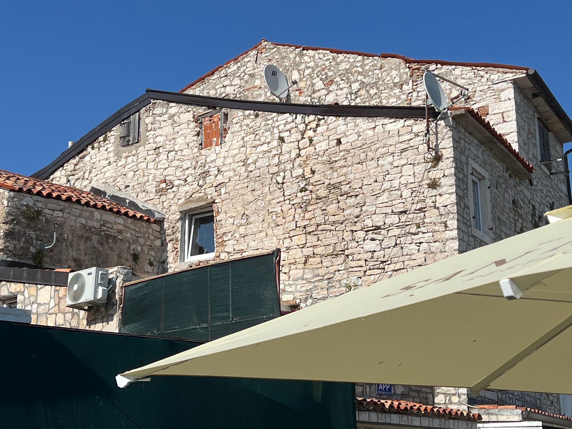 Wir haben dann erst einmal mögliche Schäden untersucht, aber außer einer dreckigen Matte vor der Dotti und viel Wasser im Boot war alles ok ;-) Juliane war schon früh schwimmen und hat die Ruhe im Meer genossen. Wir sind dann nach einem Frühstück die 10 km nach Rovinj gefahren. Außer einem kleinen Orientierungsproblem am Anfang nach einem Kilometer meinerseits lief alles wie geschmiert. Wir mussten an mehreren umgekippten Bäumen vorbeifahren und vielen abgeknickten Ästen ausweichen, aber den Weg nach Rovinj haben wir gefunden. Es war deutlich voller in der Stadt, als 2023 und 2024 im September, aber immer noch erträglich. Nur die Hitze war schon recht heftig, sodass wir in unseren Bar, siehe letzten Samstag einen Drink genommen haben.