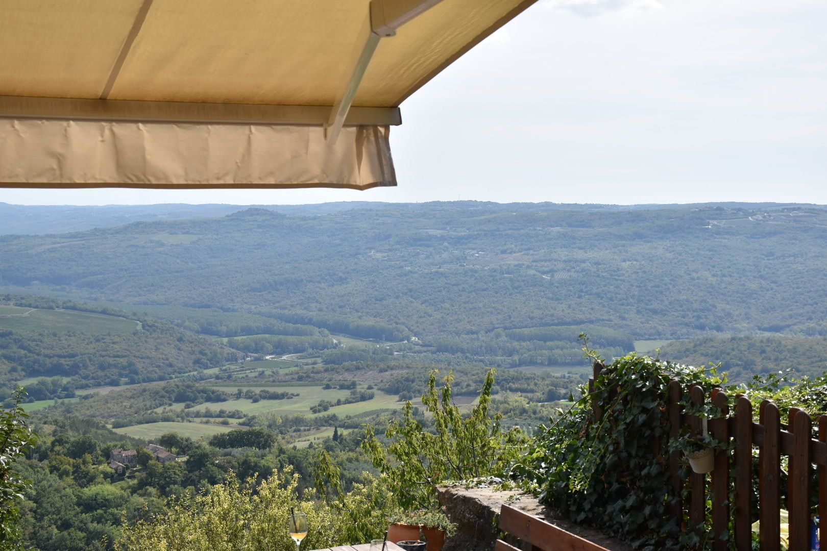 Frisch geduscht, kein Regen in Sicht können wir noch ein bisschen draußen sitzen, die Aussicht genießen und ein Glas Rotwein trinken.