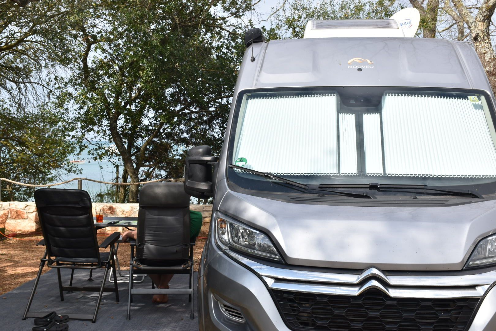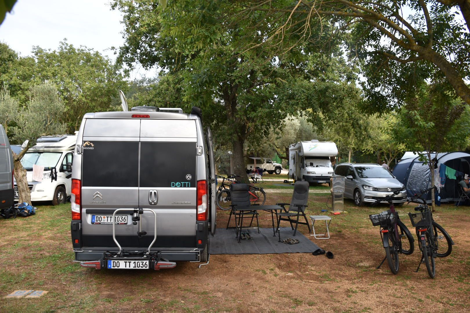 Wir haben die Parzelle neben unserem Platz vom letzten Jahr, schön breit im Schatten und trotzdem TV Empfang mit gutem Blick aufs Meer.