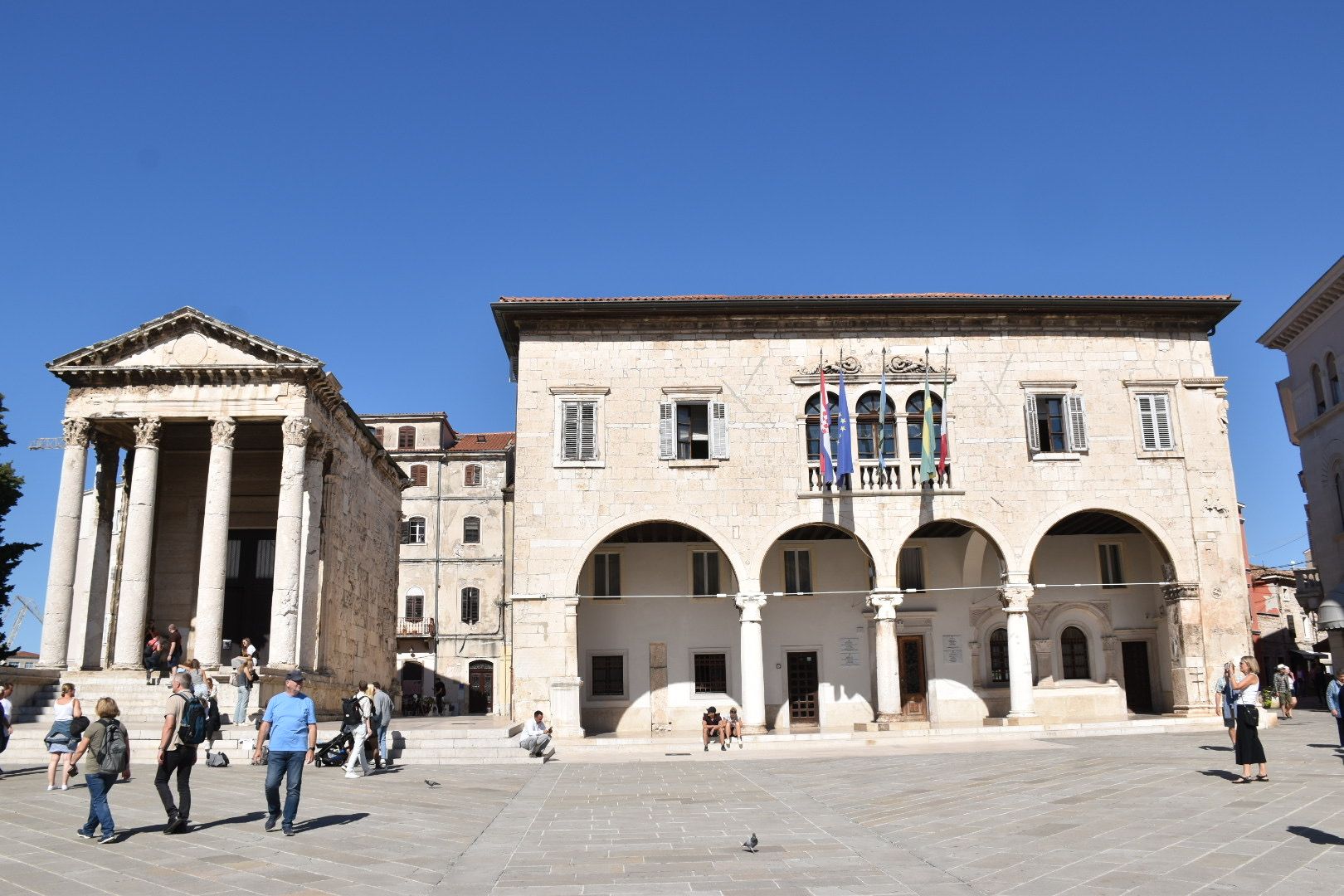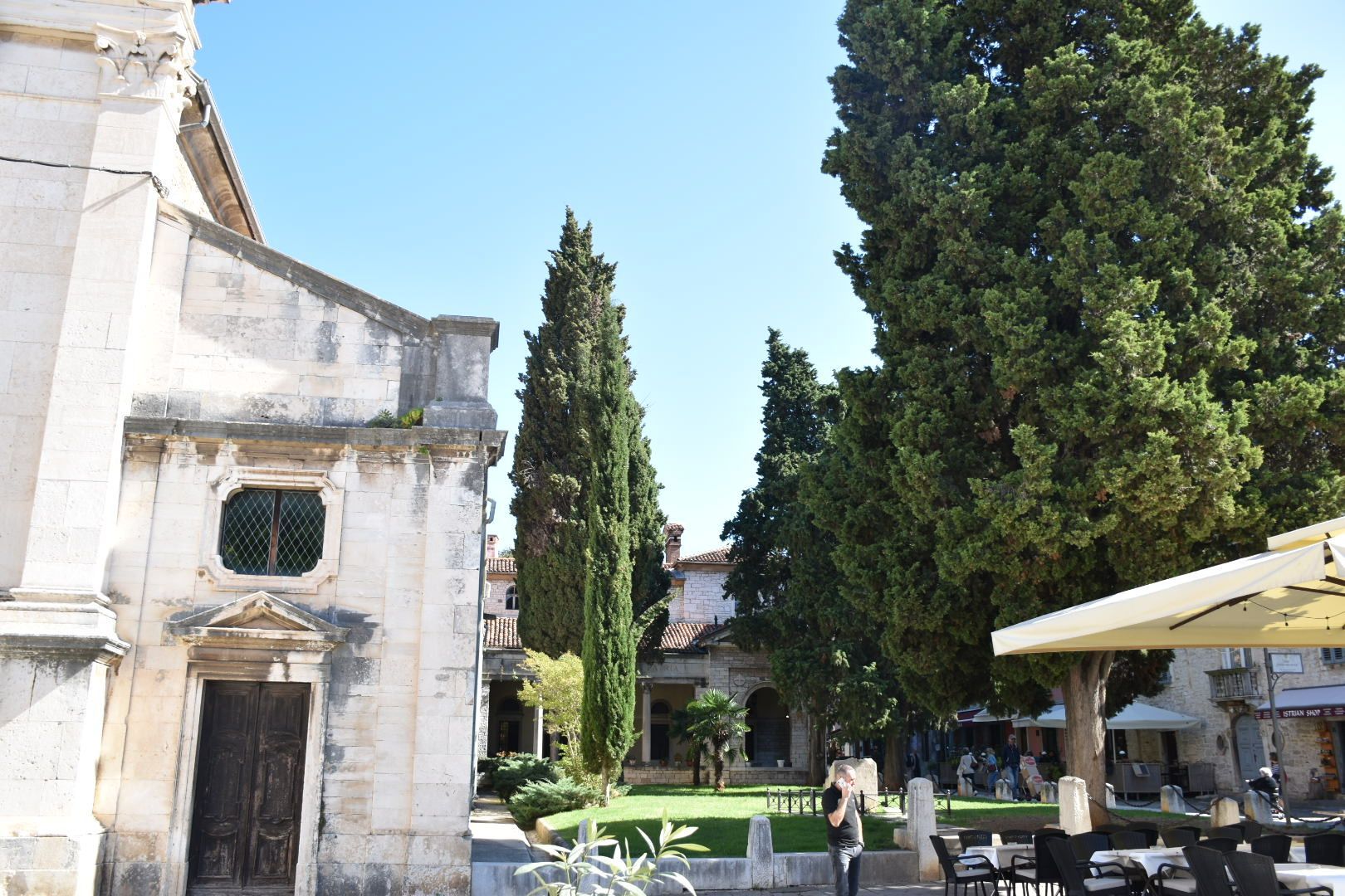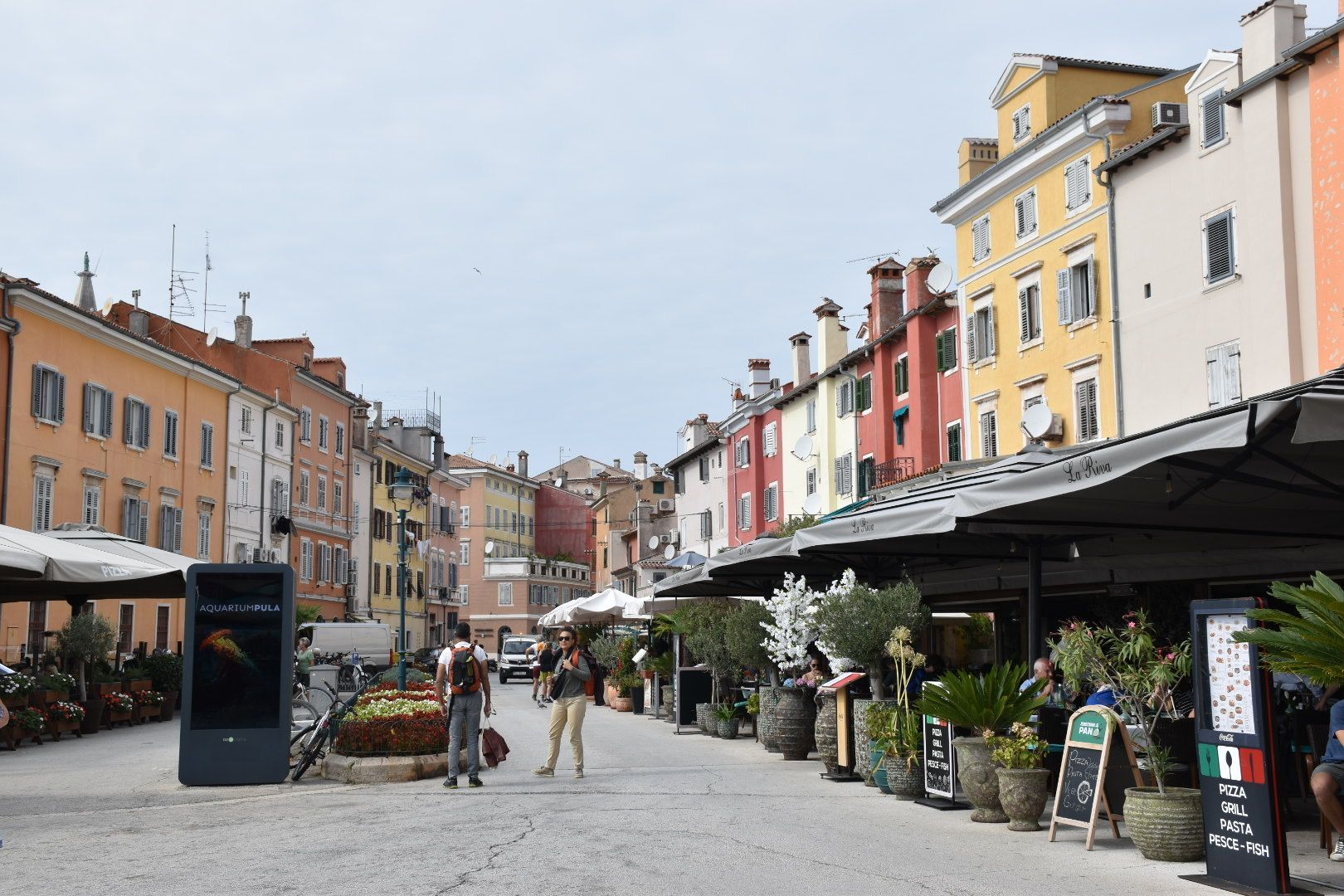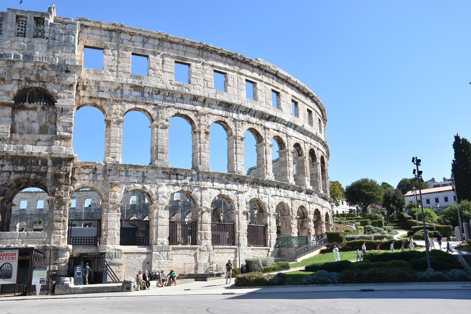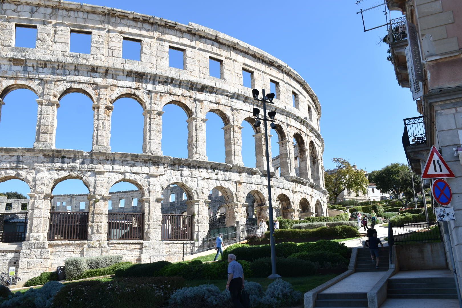 Pula ist typisch Touri-Stadt, aber trotzdem nett. Wir sind, wie vor ein paar Jahren ein wenig rumgeschlendert, haben die Sehenswürdigkeiten schnell gefunden und sind dann in der Fabbrica Pula gelandet. Es sollte da glutenfrei geben. Pizza nein, aber Nudeln, bestellt und gut. Juliane hatte eine Neapolitanische Pizza natürlich mit viel Ruccola. Beides war nicht die Offenbarung. Die Pizza ging so und in den Nudeln waren mehr Zwiebeln als alles andere. Bezahlt mit wenig Trinkgeld, weil schlecht beraten und zu den Rädern gegangen. Glücklicherweise hatten wir von gestern Abend noch drei Hähnchenspieße übrig und mitgenommen. Die hab ich denn auf einer Bank in der Sonne verspeist. So konnten wir dann zurückfahren.
