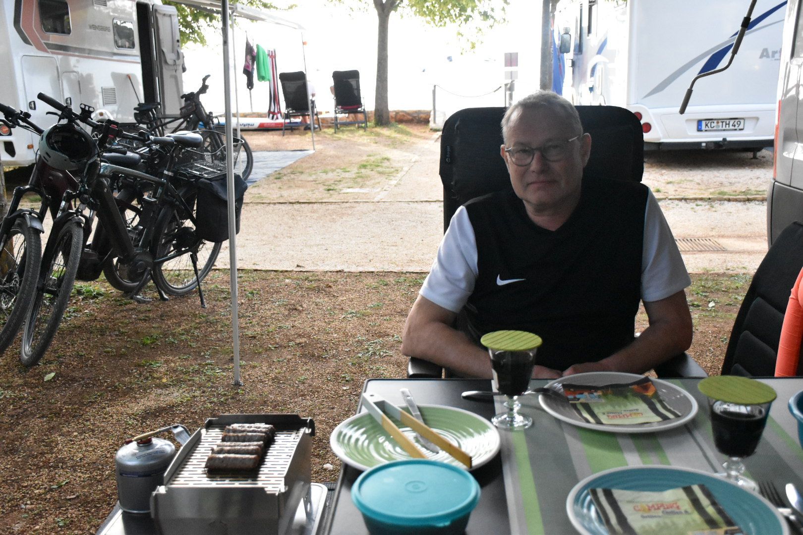 Auf dem Rückweg zum Platz mit der Unterbrechung zum Essen zog es sich zu, für heute Nacht sind Gewitter angesagt. Es hat auch jetzt schon ein paar Tropfen geregnet, aber wir bleiben erst einmal draußen sitzen.