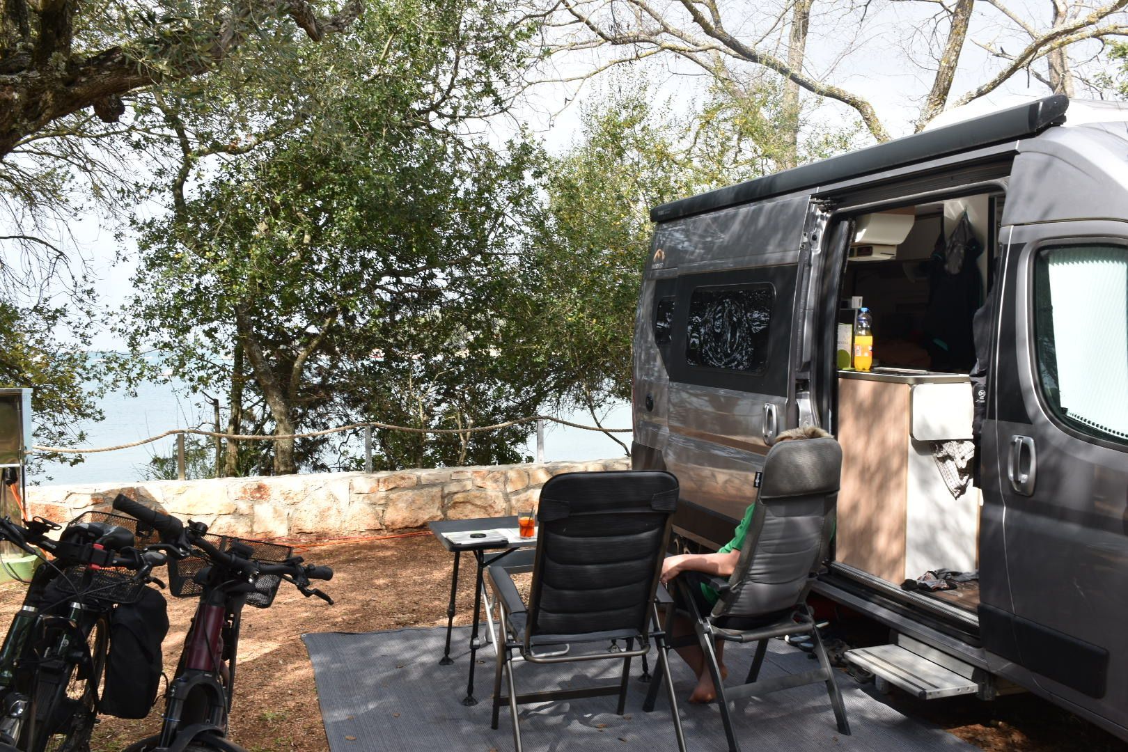 Gegen Mittag wurde es trockener, sogar mit ein paar Sonnenstrahlen und so haben wir eine Hecktür aufgemacht und einen Mittagsschlaf mit (potenziellem) Blick aufs Meer gemacht. Die Geräusche waren jedenfalls so, dass wir gut schlafen konnten. Am Nachmittag haben wir noch zwei Stunden draußen gesessen, bis es wieder anfing zu regnen. Alles für morgen eingepackt, Essen gekocht, erstmals in diesem Urlaub in der Dotti und dann duschen gegangen.