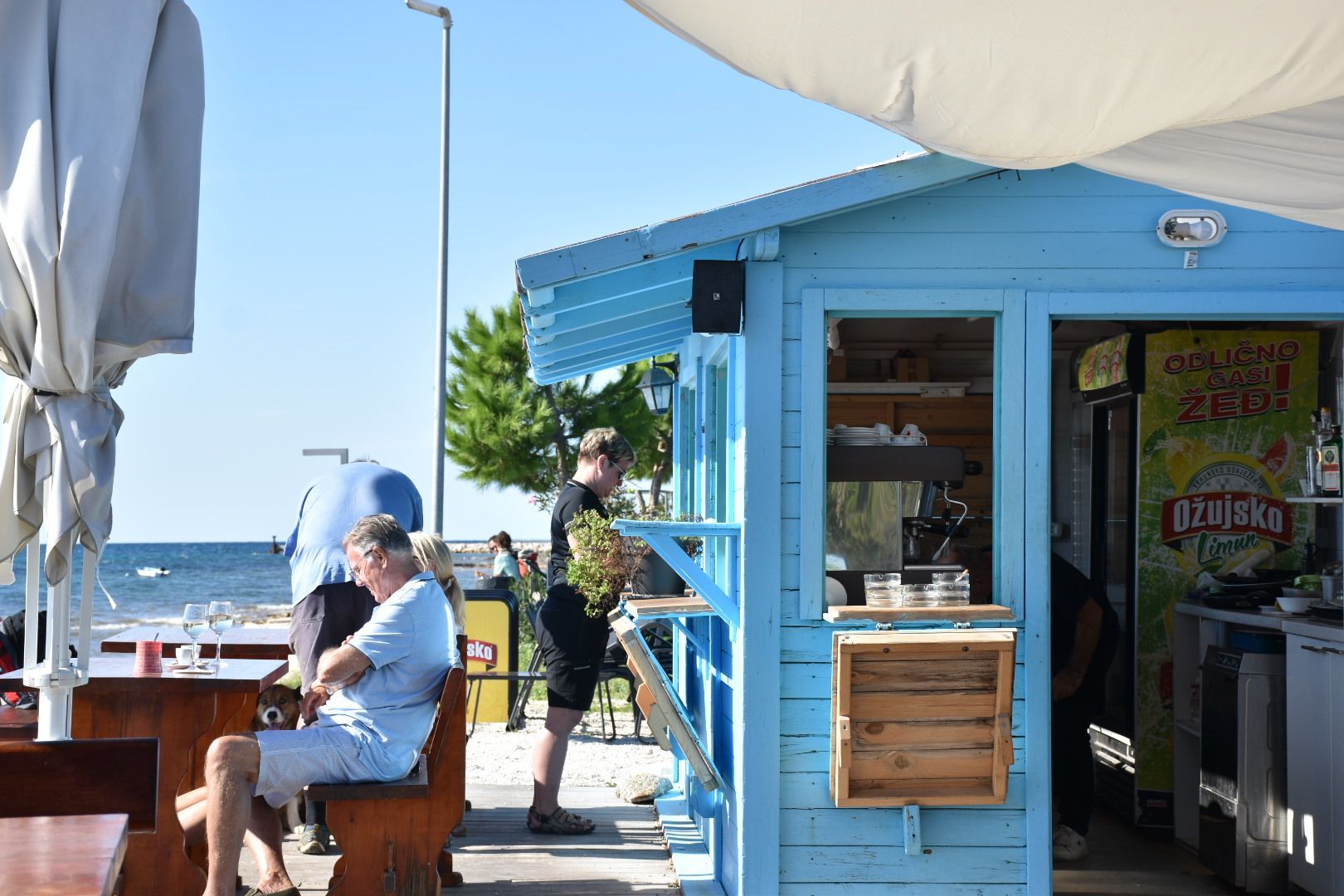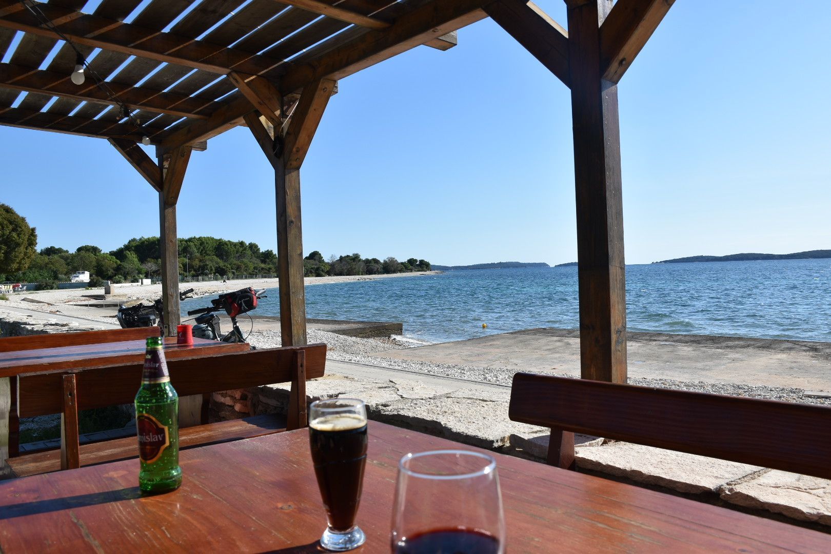 Bei Peroi haben wir dann noch einen Stopp eingelegt. Eine coole Strandbar (ein Bier, ein Wein 7 €). Die restlichen 15 km waren dann ein Klacks, aber zurück an der Dotti war klar, dass wir noch was essen mussten. Juliane war dann noch schwimmen und danach sind wir zu einem Restaurant ca. einen Kilometer entfernt gefahren.