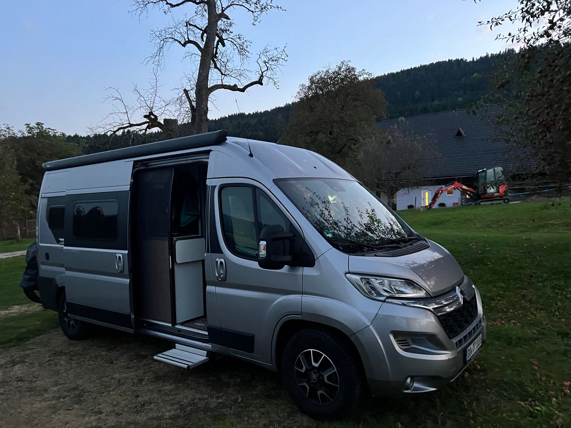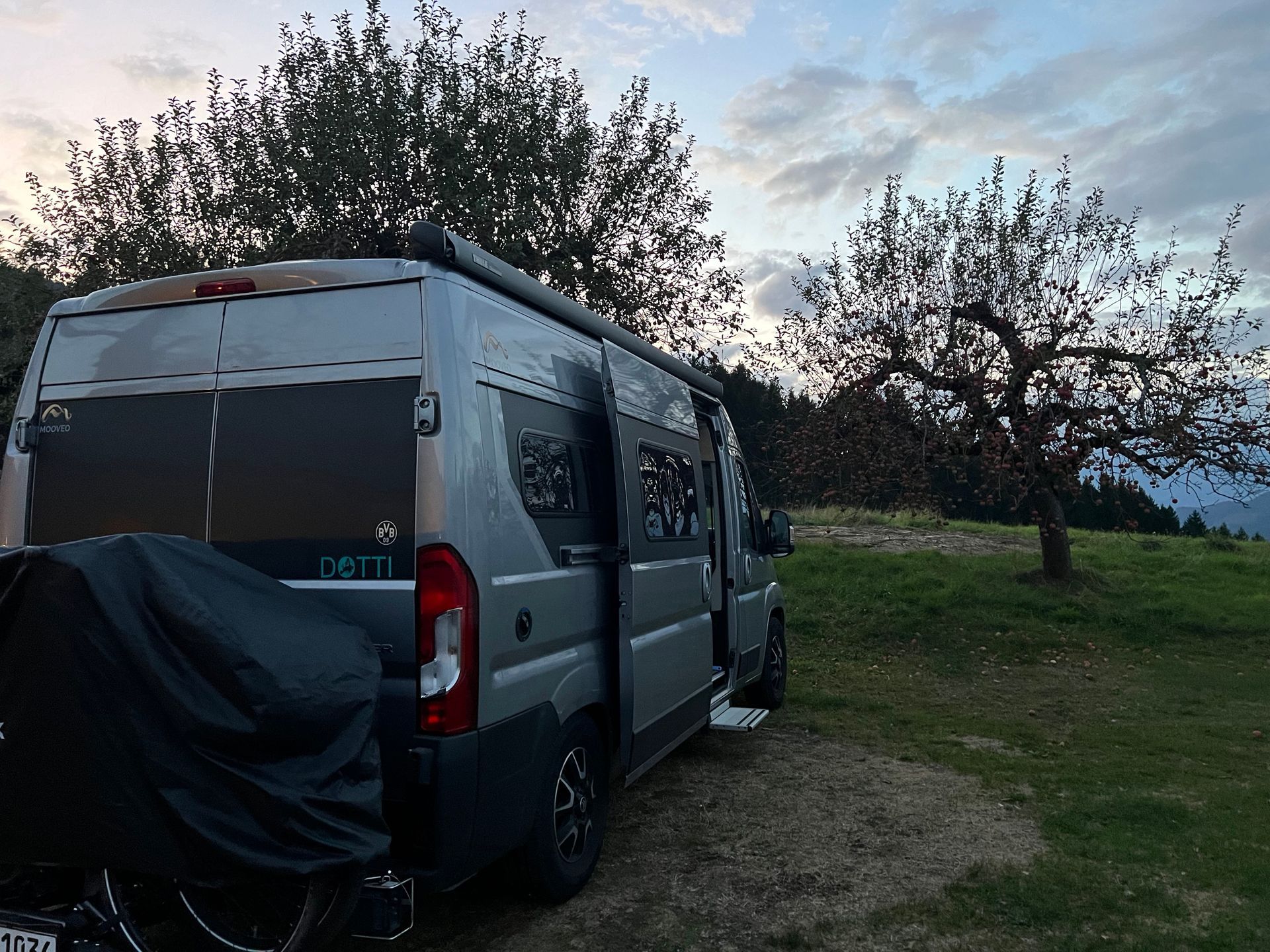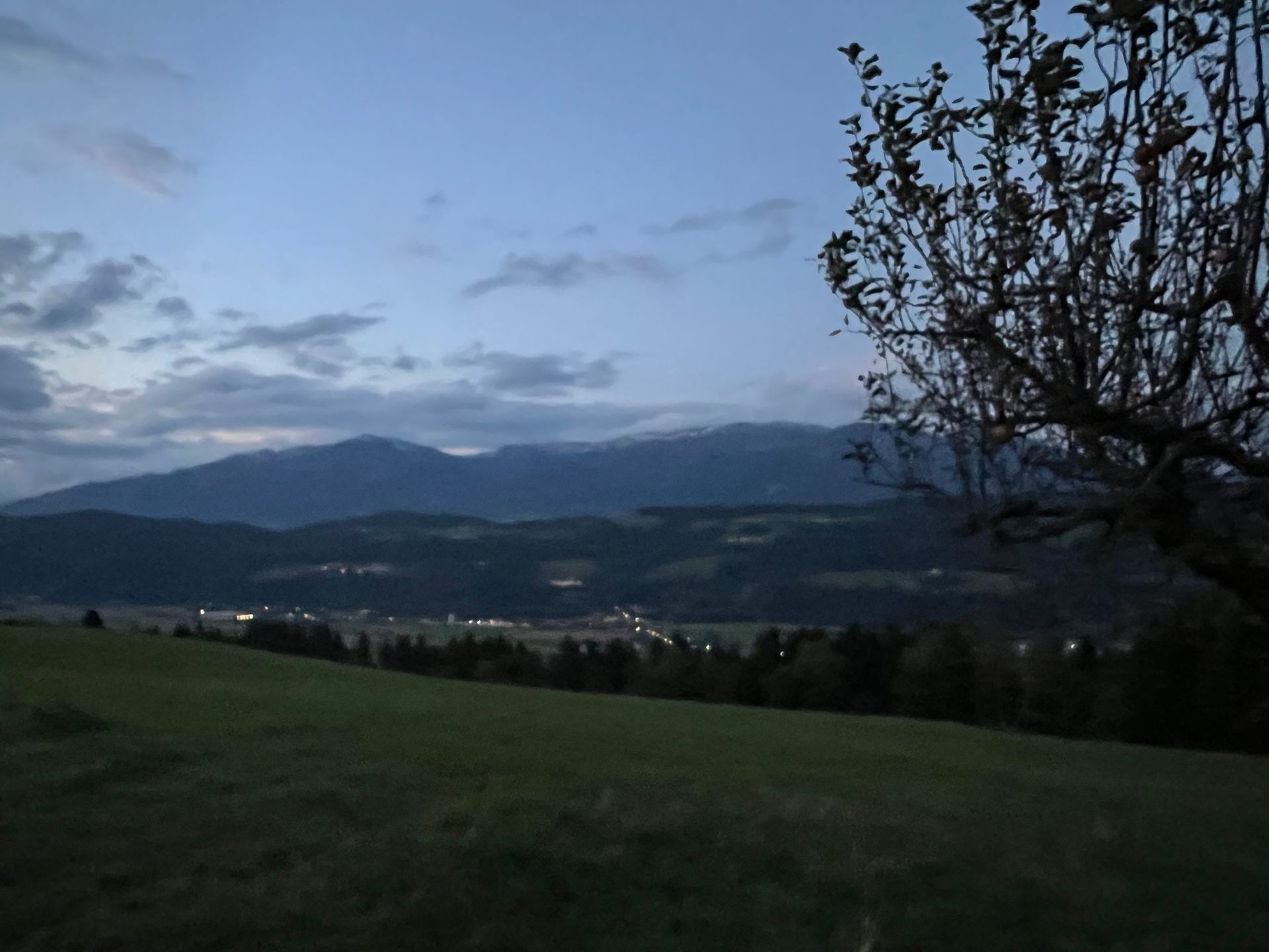 Wir stehen jetzt auf einem Bauernhof 30 km vor Villach mit schöner Aussicht auf das Drau-Tal. Leider ist es schnell dunkel und jetzt auch kälter geworden und wir sitzen in der Dotti und schauen noch ein bisschen fern.