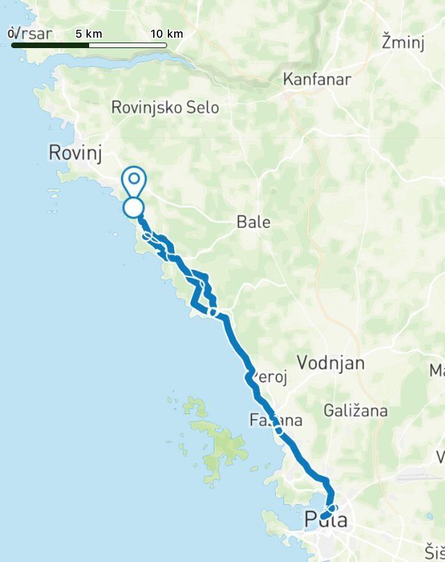 Heute war im Gegensatz zu gestern ein Action-Tag. Wir sind nach Pula mit dem Rad gefahren, insgesamt 60 Kilometer. Eine, bis auf die letzten 3 Kilometer nach Pula und die ersten zurück tolle Tour (von Komoot ).