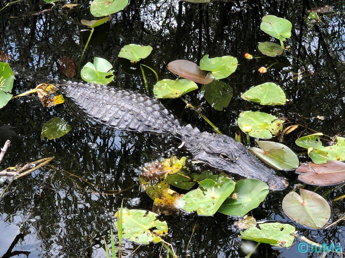 Nach einiger Zeit sind wir dann aber nicht mehr bei jedem Alligator stehen geblieben und ruhig weitergefahren. Der Park war insgesamt mehr als ein halbes Jahr geschlossen, also hat man einiges getan. Den Parkplatz und das Empfangsgebäude hat man komplett neu gemacht und die Fahrspur durch den Park verbreitert. Da muss der letzte Hurrikan in 2017 ja einiges kaputt gemacht haben. Dafür waren diesmal erheblich weniger Alligatoren zu sehen als bei meinem letzten Besuch. Aber es ist immer noch ein Highlight, wenn so ein großes Tier nur 2-3 Meter von einem weg im Wasser liegt. Einen Kampf um Beute zwischen einem Reiher und drei Geiern konnten wir dann auch noch beobachten, den der Reiher aus unserer Sicht überraschenderweise gewinnen konnte.