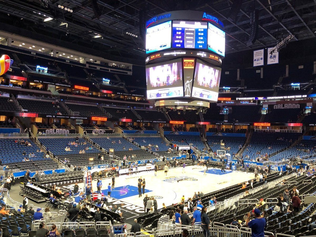 Nach einer kleinen Pause und einem Bier haben wir uns dann mit dem Taxi auf dem Weg zum Stadion gemacht. Wir wollten ja nichts verpassen und sind daher früh los (Südtribünen Erfahrung). Am Stadion angekommen war schon ordentlich was los, Liveband schminken in den Farben der Magics (Blau/Weiß, geht ja gar nicht!) und andere Basketball Spielchen. Die Türen öffneten dann genau 90' vor dem Spiel, also anders als bei uns. Dafür aber die Eingänge besser überwacht mit Personenkontrolle, Metalldetektor und allem drum und dran. Eine Frau vor uns kam dann auch wegen zu großer Tasche, auch wenn kaum was drin war nicht mit der Tasche rein. Oben auf der Ebene mit unseren Plätzen dürften wir dann aber auch nicht gleich in unseren Block, der öffnete erst eine Stunde vor Spielbeginn. Also mussten wir uns noch verpflegen (ist wohl auch der Sinn der Sache). Zwei Gyrosteller auf Nachos und zwei Bier, welches ich dann wohl falsch ausgesucht hatte, es schmeckte nämlich nicht gut. Egal, über die Preise hier denke ich mittlerweile nur noch am Rande nach! Als wir dann auf unsere Plätze kamen wurde mir schnell klar, dass es hier heute nicht so viel um Basketball geht.