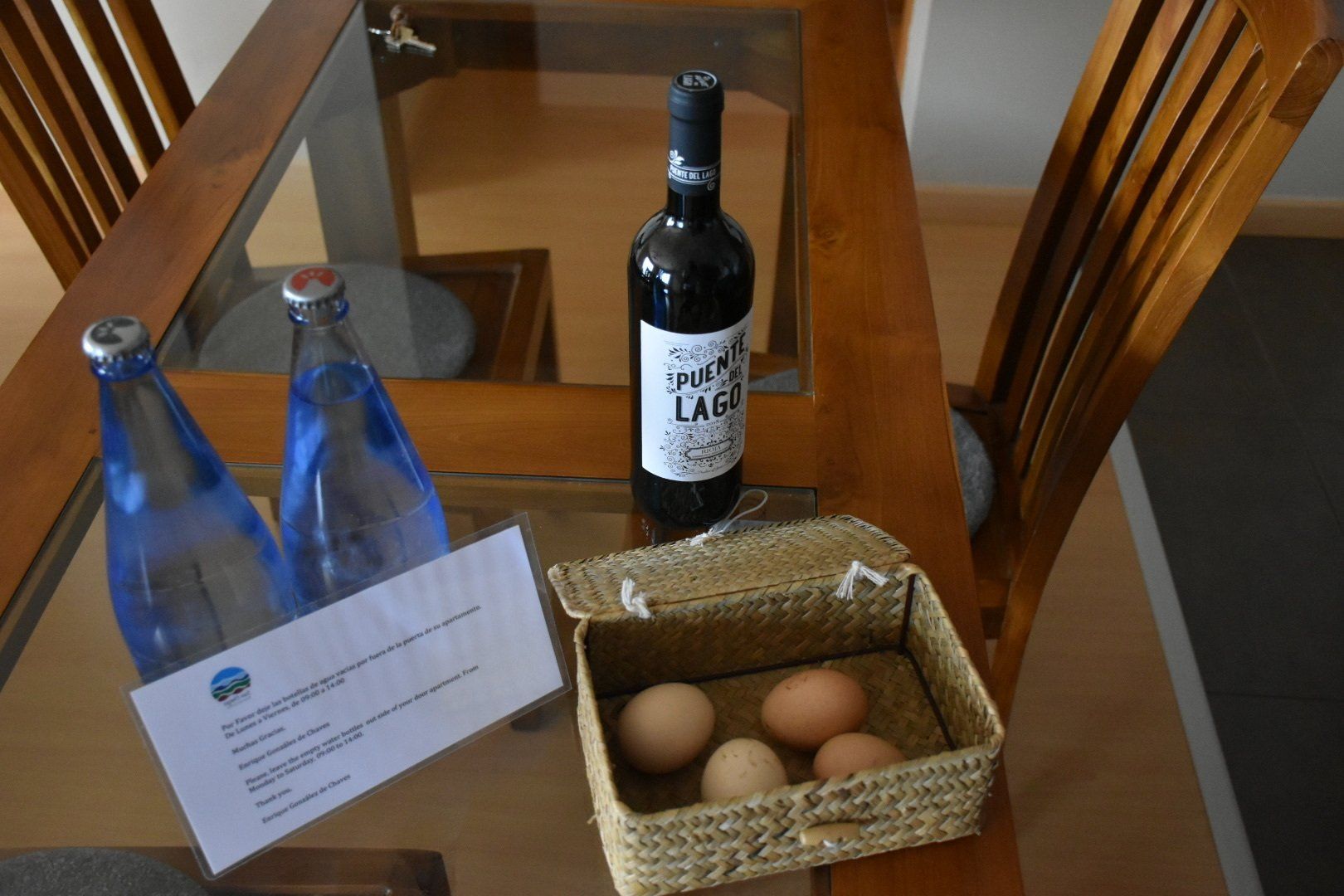 Der Schlüssel lag wie angekündigt unter der Fußmatte. Tür auf und eine wirklich schöne nette Überraschung. Auf dem Tisch standen zwei Flaschen Wasser, eine Flasche Wein und ein Körbchen mit vier Eiern 🥚🥚🥚🥚. Wirklich eine nette Begrüßung! Nachdem wir die geräumige Wohnung in Beschlag genommen haben, ausgepackt hatten sind wir dann zum Einkaufen gefahren. Es war ein großer Mercadona direkt an der Autobahn zwei Ausfahrten entfernt, da haben wir uns mit dem Nötigsten eingedeckt.