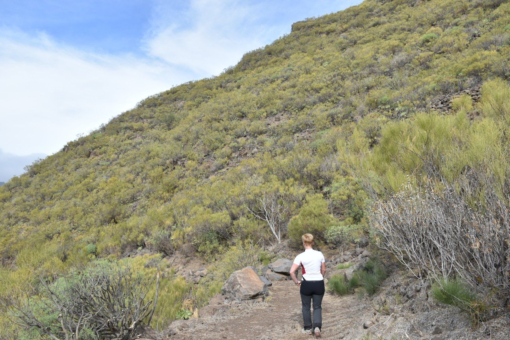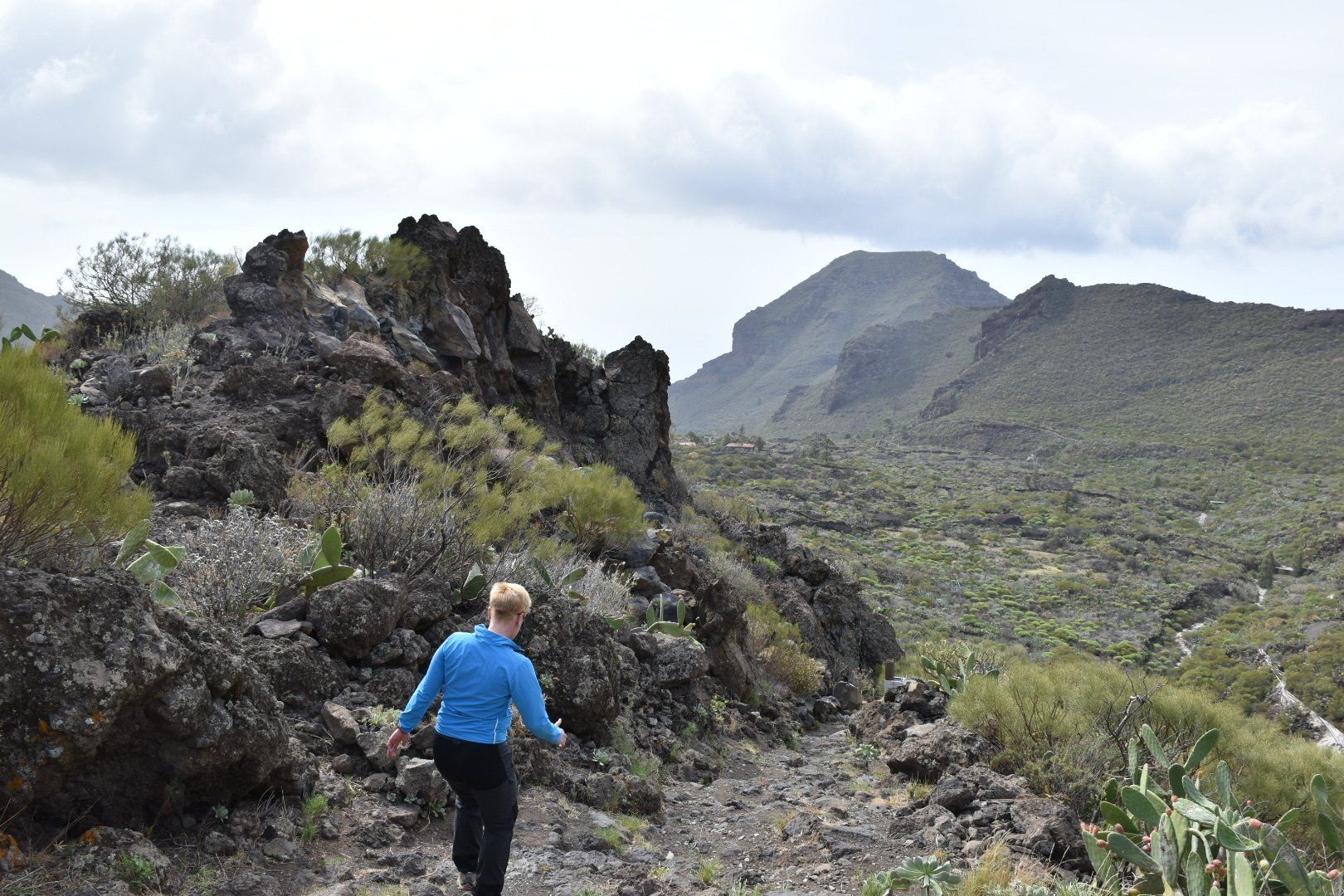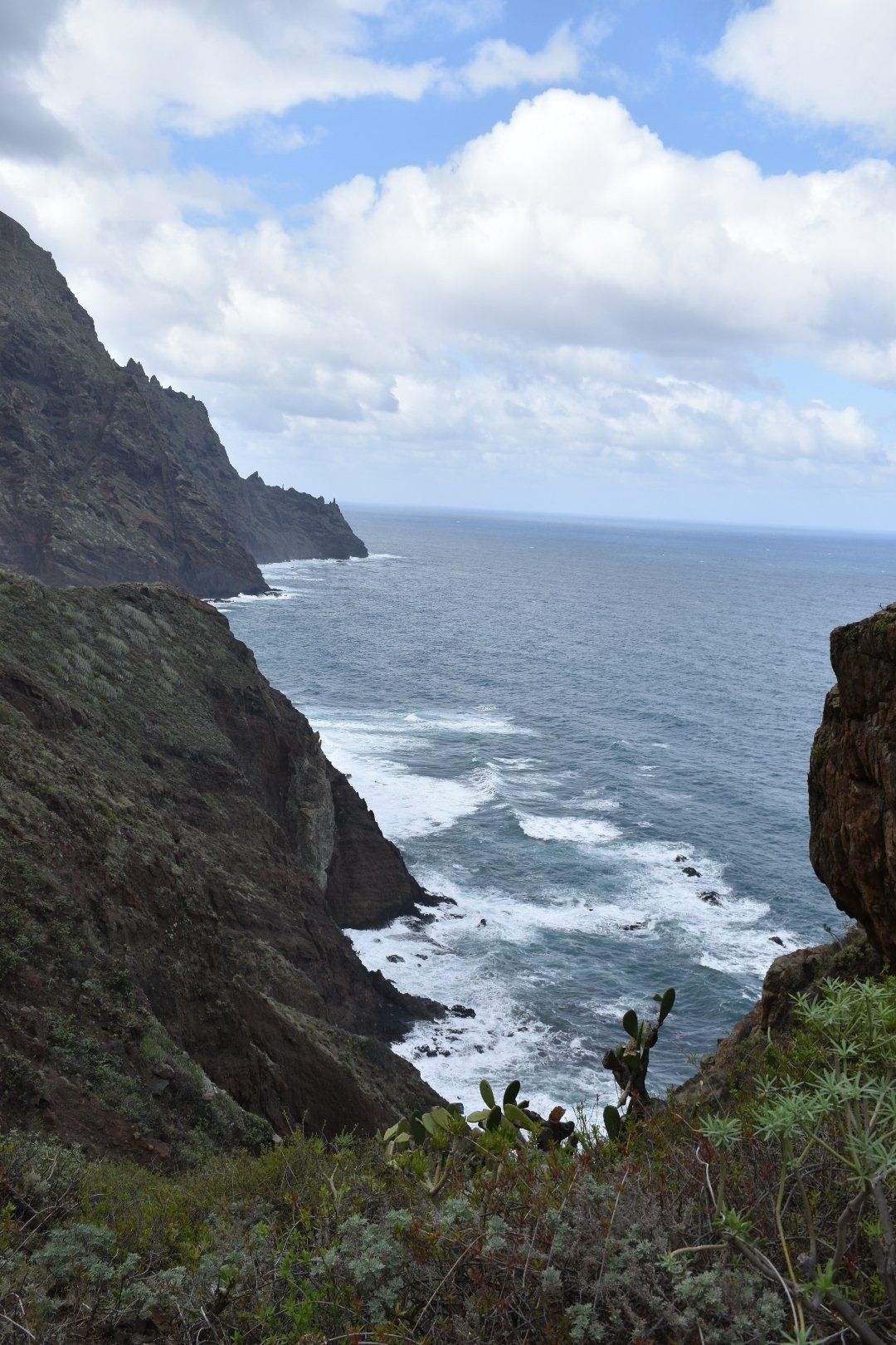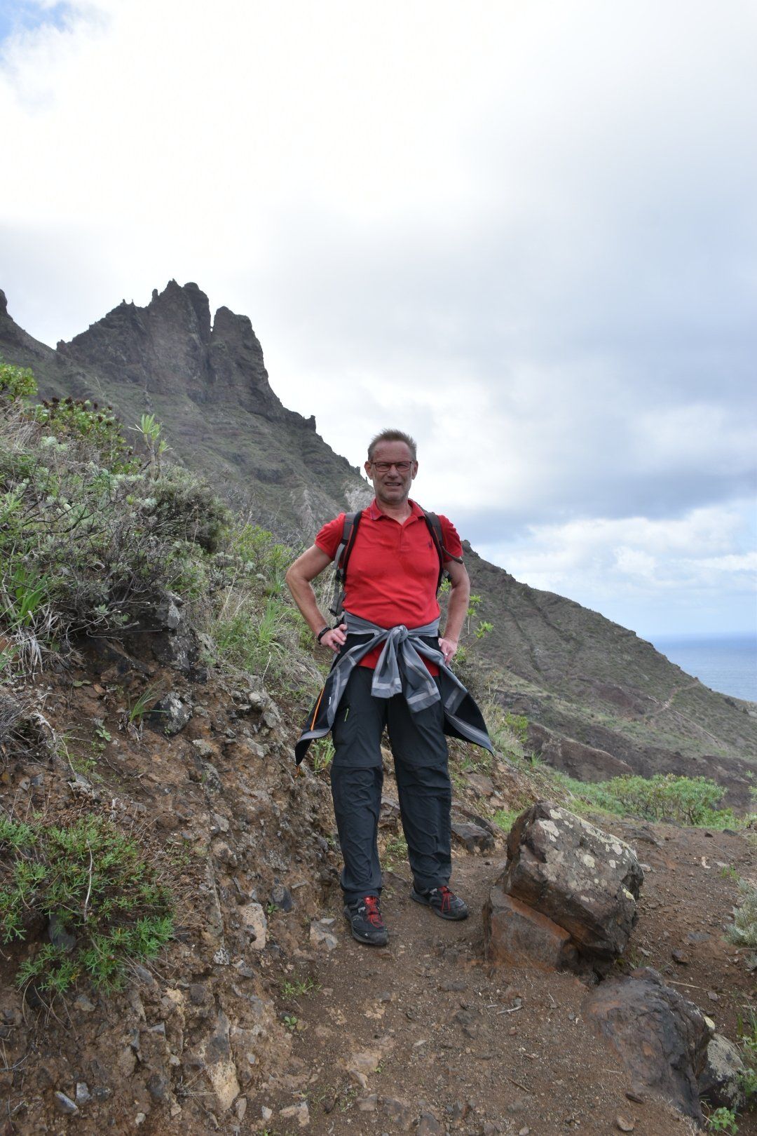 Wir sind dann zu dem Ausgangspunkt unserer heutigen Tour gefahren, so wie das Navi meinte. Es war sehr windig bei ca. 14 Grad, also Jacke übergezogen, Rucksack auf, Kamera bereit und los ging es Richtung Meer. Unterwegs war uns beiden zu warm, also Jacke aus. Irgendwie waren sich alle Mitstreiter, von denen es einige gab, nicht so richtig einig, was wohl die richtige Kleidung war. Die meisten Mitstreiter haben wir öfter getroffen und teilweise gemeinsam Pause gemacht und mit einigen auch ein paar nette Worte gewechselt, wie das so üblich unter Wanderern 🥾 der erste Teil der Wanderung war echt 👍 mit tollen Aussichten (siehe viele Bilder) und relativ entspannt mit einigen Passagen bei denen Höhenangst nicht so toll gewesen wäre. Es ging auf diesem „Höhenwanderweg mit tollem Panorama“ hoch und runter mit tollen Aussichten. Wenn man den Plan intensiver gelesen hätte, hätte man sich etwa 300 Höhenmeter (150 runter und 150 hoch) sparen können, dann aber auch kein Bier, keinen Salat und keine „Papas Arrugadas“ bekommen. Naja, nachher ist man immer schlauer, aber auch satter 😋