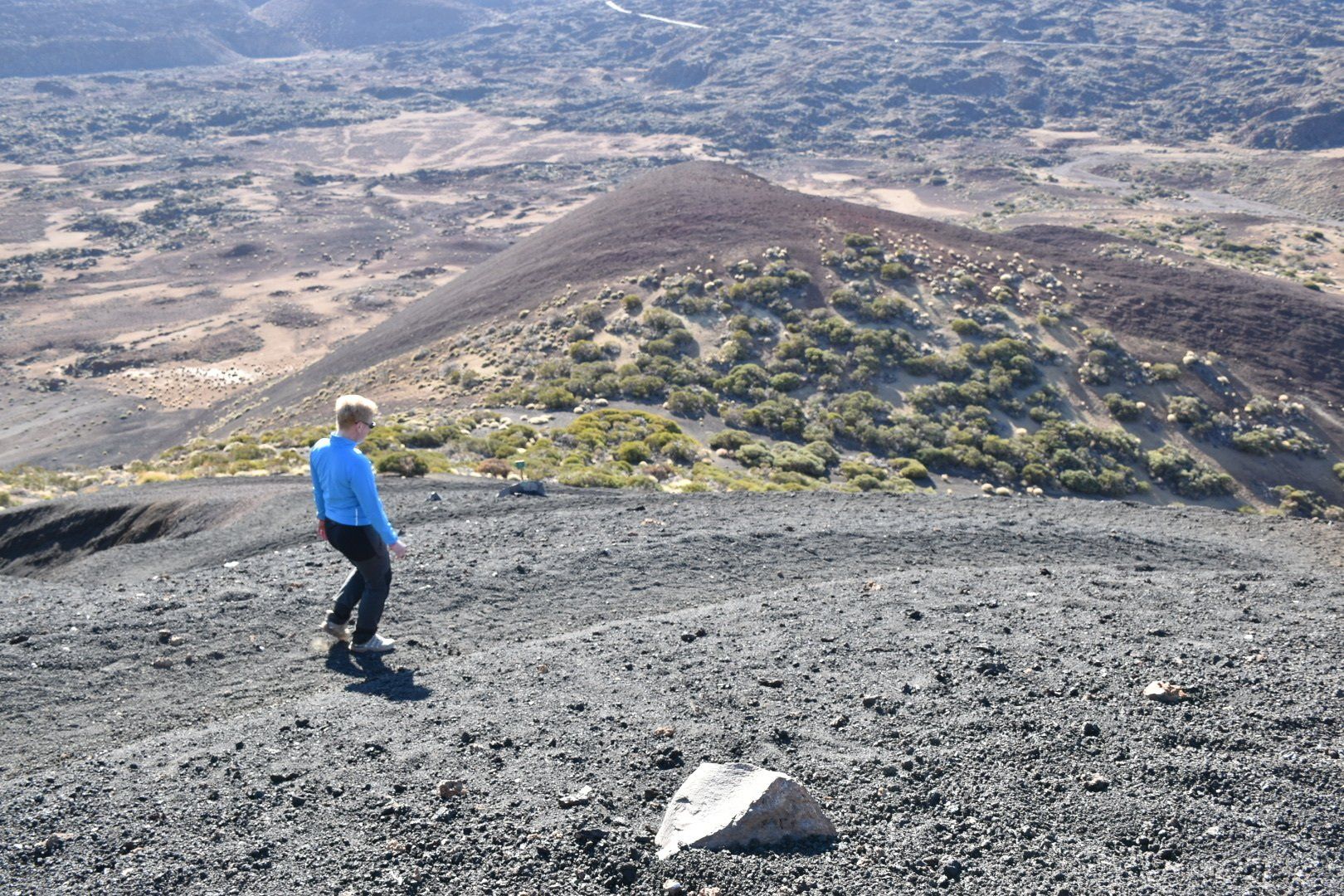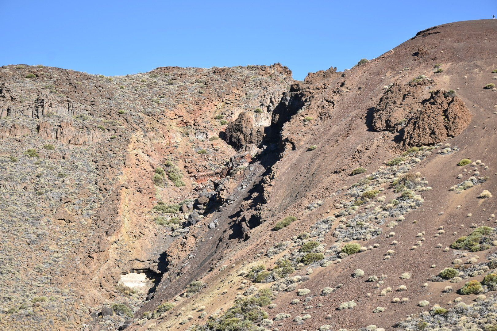 Wir haben uns dann zunächst dem Navi anvertraut um uns zum Startpunkt der Wanderung zu bringen, aber nachdem es uns mehrfach durch kleine steile Straßen führte sind wir dann einfach der TF21 gefolgt an deren Kreuzung mit der TF24 der Start der Wanderung sein sollte. In Puerto de la Cruz schien noch die Sonne bei 22 Grad weiter oben war auf einmal Nebel bei 14 Grad. Wir sind dann durch den Nebel immer weiter hoch durch enge und weite Kurven gefahren und haben uns den Berg erarbeitet. Ab etwa 1.800 Meter war der Nebel auf einmal weg und die Sonne schien wieder. Weiter hoch ging es bis Portillo auf 1.980 Meter. Dort haben wir an einem Restaurant geparkt und unsere heutige Wanderung gestartet. Es sollten etwa 12 Kilometer und 400 Höhenmeter werden, also entspannter als am ersten Tag. Die Runde bestand aus zwei Bergumrundungen, bei denen man oft den Blick auf Teide hatte. Es war toll, durch die roten und die schwarzen Lava-Felder zu wandern bei strahlendem Sonnenschein mit Blick auf den Teide oder die Wolkenschicht unter uns. Ganz anders als die Wanderung gestern, aber auch sehr schön und nicht so anstrengend. Nach etwa 8 Kilometer etwa auf dem höchsten Punkt der Strecke haben wir dann eine kurze Rast gemacht und unser Baguette/Brezel gegessen. Dann folgte der aus meiner Sicht Höhepunkt dieser Tour. Nachdem wir einige Abbruchkanten mit verschiedenfarbigen Ablagerungen passiert hatten ging es in kleinen Serpentinen ein Lavafeld aus schwarzer Asche recht steil den Berg runter. Man konnte den Weg kaum erkennen und es war recht rutschig durch die kleine Körnung der Asche. Man musste schon sehr aufpassen um nicht ins Rutschen zu geraten. Der Rest des Weges ging dann durch ein Tal immer weiter den Berg runter zum Ausgangspunkt der Tour. Dort haben wir gegen 17.00, das Restaurant machte gerade zu, uns noch ein kleines Bier gegönnt. Komisch, aber nach 17.00 geht da oben nix mehr und unser Auto war auch fast das letzte auf dem Parkplatz.