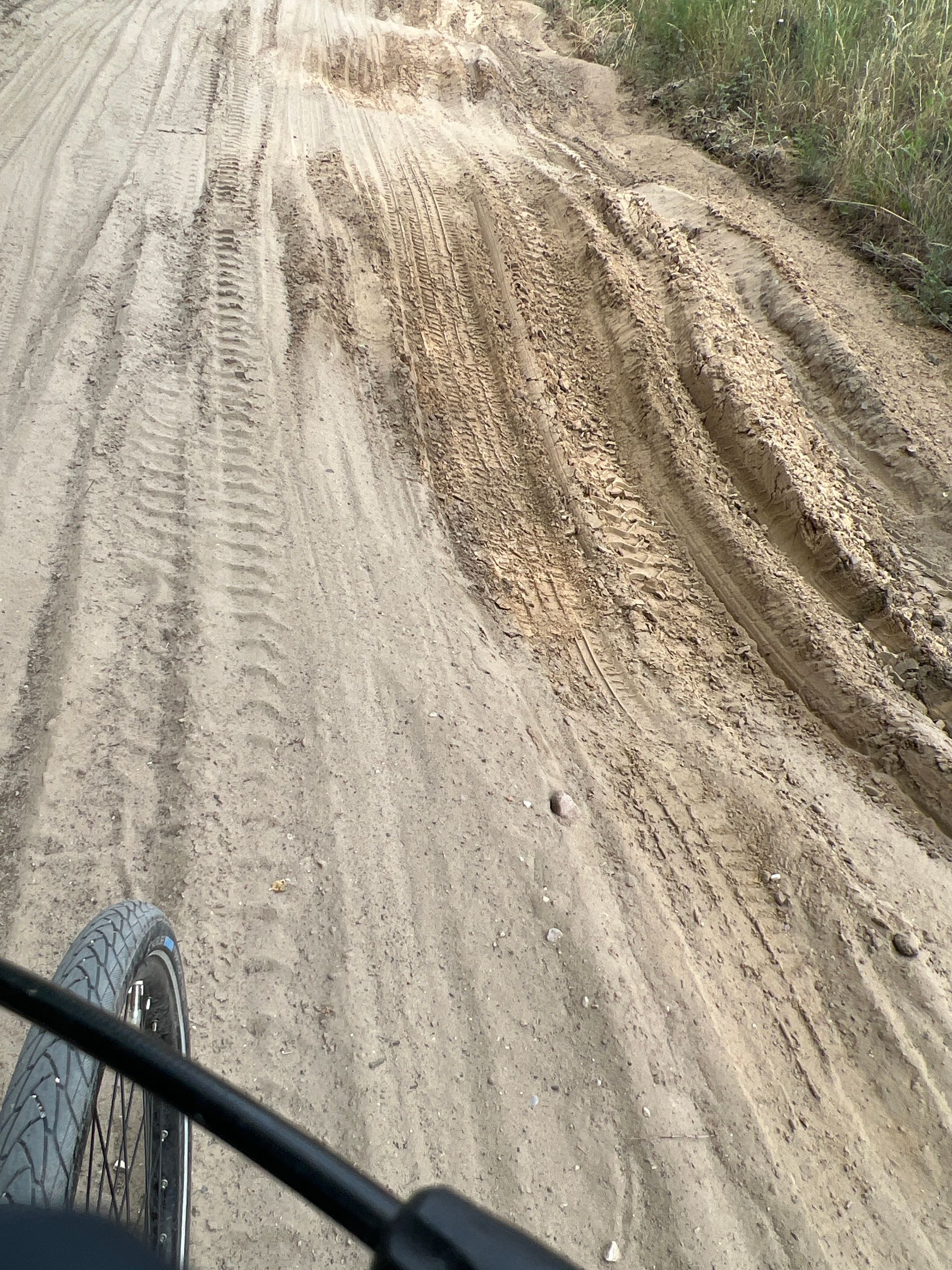 Dort ist dann eine Gruppe von Rentnern mit verschiedensten Rädern mit einem Guide vorbeigefahren, die wir dann auf einer der unsäglichen Sandpassagen überholt haben. Zu dem Zeitpunkt haben alle geschoben.