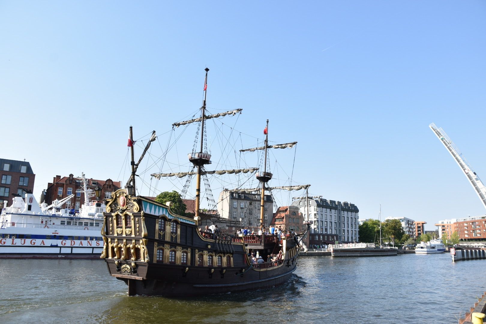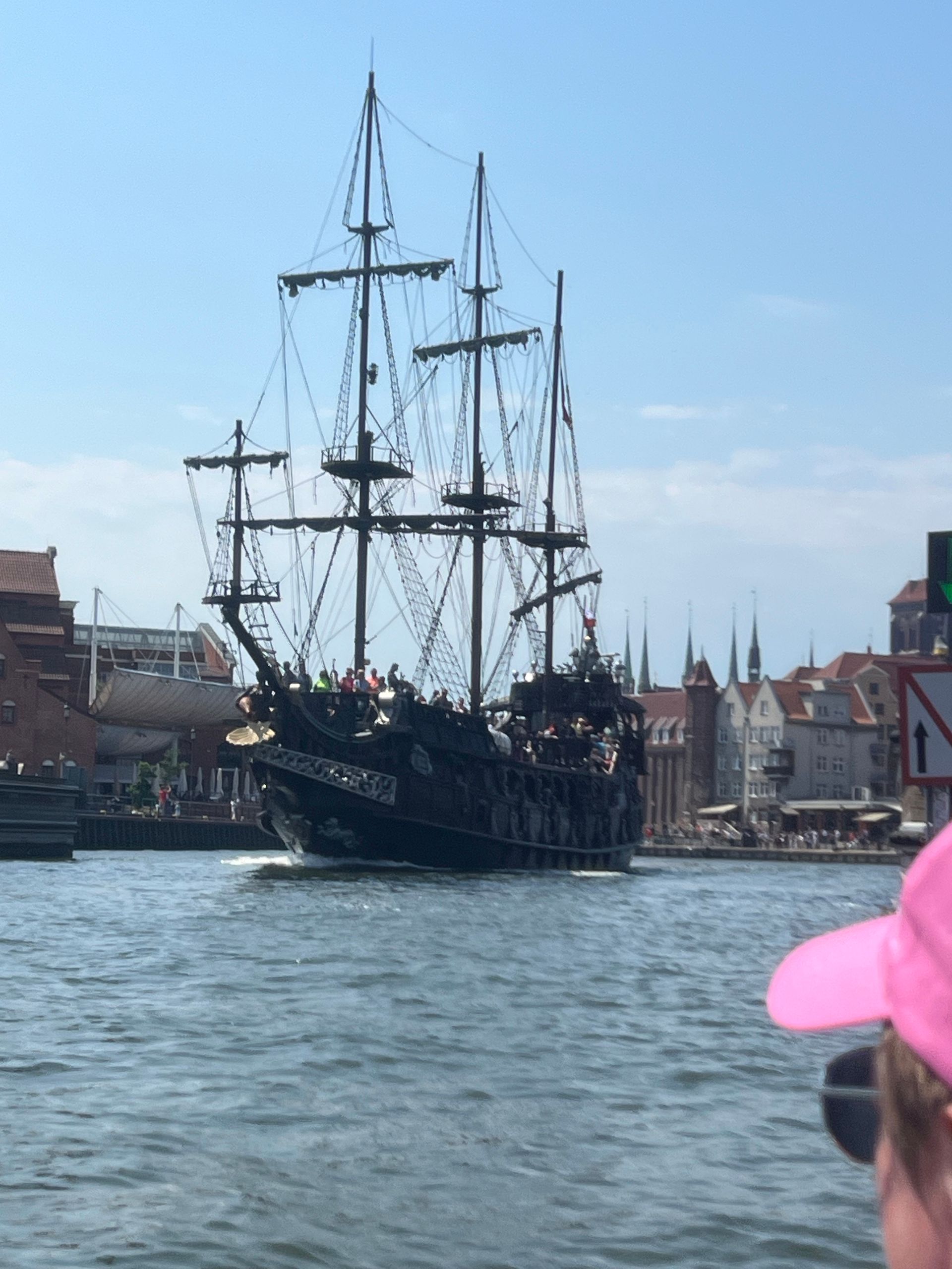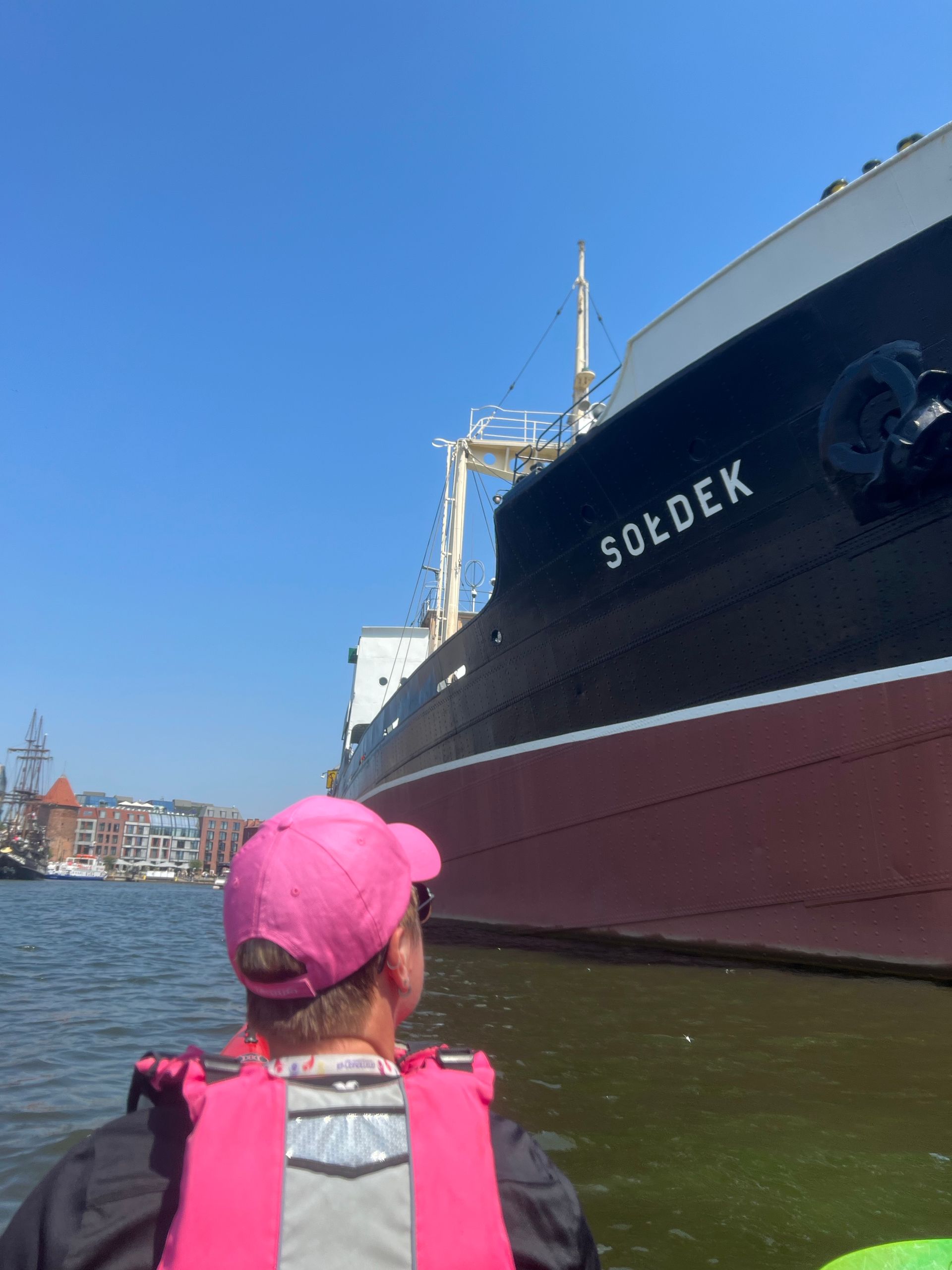 Wir haben dann gut gefrühstückt, nicht wie üblich und sind mit den Fahrrädern Richtung Danzig aufgebrochen. Dort wollten wir Danzig vom Wasser aus sehen, also ein Kajak für zwei Stunden gebucht und rauf aufs Wasser. Wir sind gemächlich durch die Hafenanlagen gepaddelt und haben alles von gestern noch einmal aus einer anderen Perspektive gesehen und geknipst. Auf dem Rückweg um Punkt Mittag hat man extra für uns die große Brücke hochgezogen 😉. Nach uns kamen dann die üblichen Verdächtigen von gestern, der große Dampfer und das Piratenschiff, die wären sonst nicht rausgekommen 🤣. Noch ein wenig durch die Seitenarme gepaddelt und dann waren die zwei Stunden schon um. 50 Slotty, also 12,50 € ärmer haben wir die zwei Stunden genossen.