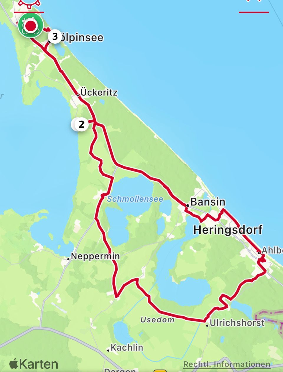 Die bei Komoot ausgesuchte Tour führte leider über die ersten 10 km über eine Landstraße. Mitten durch den Wald, hoch und runter, aber leider auch eng und viel befahren. Spitzengeschwindigkeit 46,4 km/h bergab 🚴♀️🚴🏼😉. Der folgende Teil ging dann zuerst über eine Nebenstraße an mehreren Seen vorbei durch den Nationalpark. Dann noch einige sandige Passagen, bevor wir noch etwa 5 km auf einem Waldweg zurückgelegt haben. Wir haben uns dann noch Misdroy angeschaut, wie „Ballermann“!