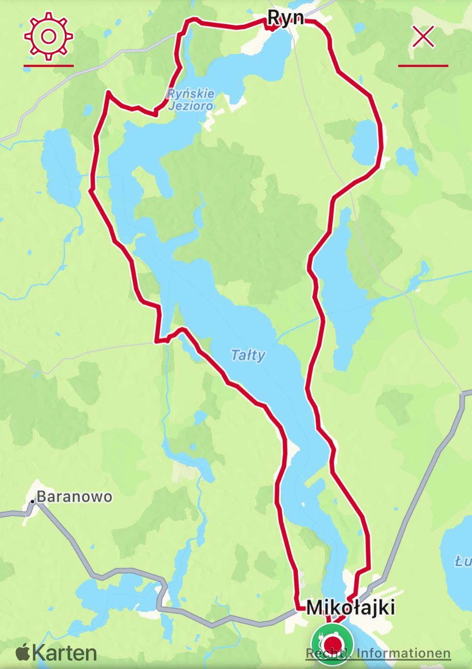 Wir haben dann nach etwa 20 km in Ryn eine Pause in einem Restaurant gemacht und einen Ceasar-Salat gegessen. Es war am äußersten Ende des Jezioro Tatty Sees an dem wir unten in Mikolaikj unseren Platz haben.