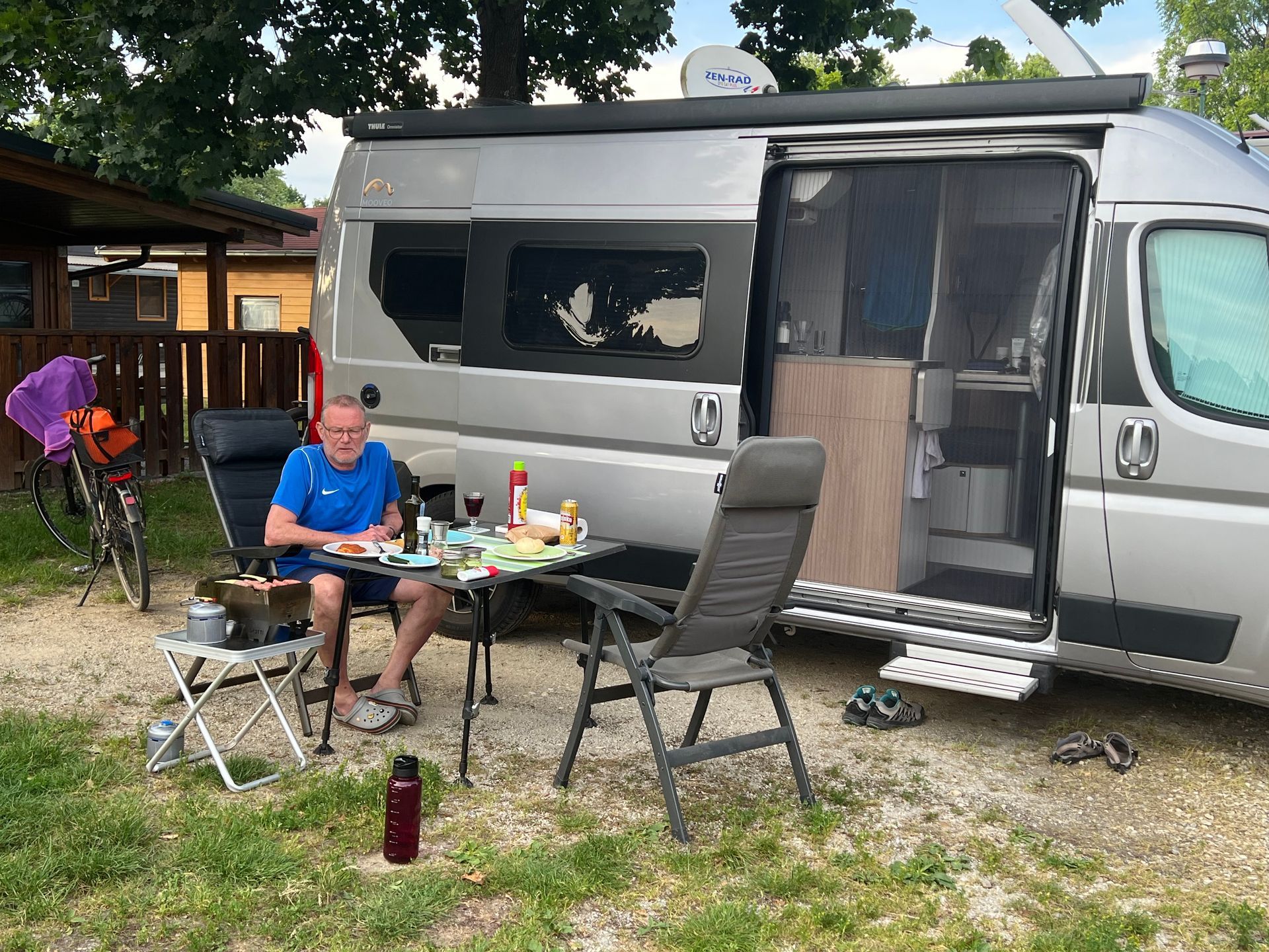 Heute war ein echter Gammeltag. Ich war schon gegen 7.30 wach und bin dann rausgegangen. Juliane ist bis gegen 9.00 liegen geblieben. Dann in aller Ruhe Kaffee getrunken und gegen 10.30 gefrühstückt. Es war schon sehr warm, aber wir haben auf unserem Platz fast den ganzen Tag Schatten, sodass wir keine Markise brauchen. Wir haben uns dann angehört und angeschaut, wie Familien mit 2-3 Kindern so reisen: Neben uns ein Paar mit zwei Kindern und im September kommt das dritte Kind. Ein Bulli, ein Zelt, in dem nur Sachen lagern, alle vier schlafen im Bulli. Auf der anderen Seite ein 5,40 Meter WoMo mit Aufstelldach, Familie mit drei Kindern.