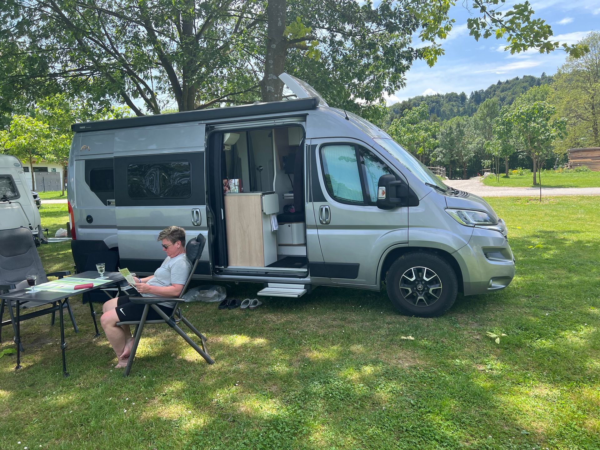Über heute gibt es eigentlich gar nicht viel zu berichten. Wir sind um 8.00 wach geworden, Juliane hat ihren Kaffee bekommen, ist aber noch liegen geblieben. Ich habe mich in den Halbschatten vor der Dotti gesetzt und das Platzleben verfolgt. Wir haben dann gegen 11.00 ein spätes Frühstück zu uns genommen und versucht die nächsten Tage zu planen. Erst einmal haben wir hier einen Tag verlängert. In Ljubljana ist außer auf doofen Stellplätzen nichts frei in der nächsten Zeit. Echt blöd und schlecht geplant: Hier ist ja auch Pfingsten und die Bayern haben seit gestern Ferien und in der nächsten Woche kommt dann noch BaWü dazu!
