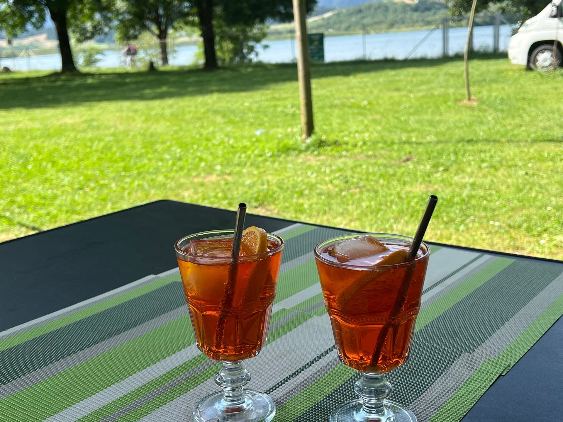 Wieder am Platz mussten wir noch einmal Pause machen, bevor wir gegen 18.30 schwimmen waren. Jetzt sitzen wir hier an der Dotti, ich schreibe und Juliane sorgt für die Getränke.