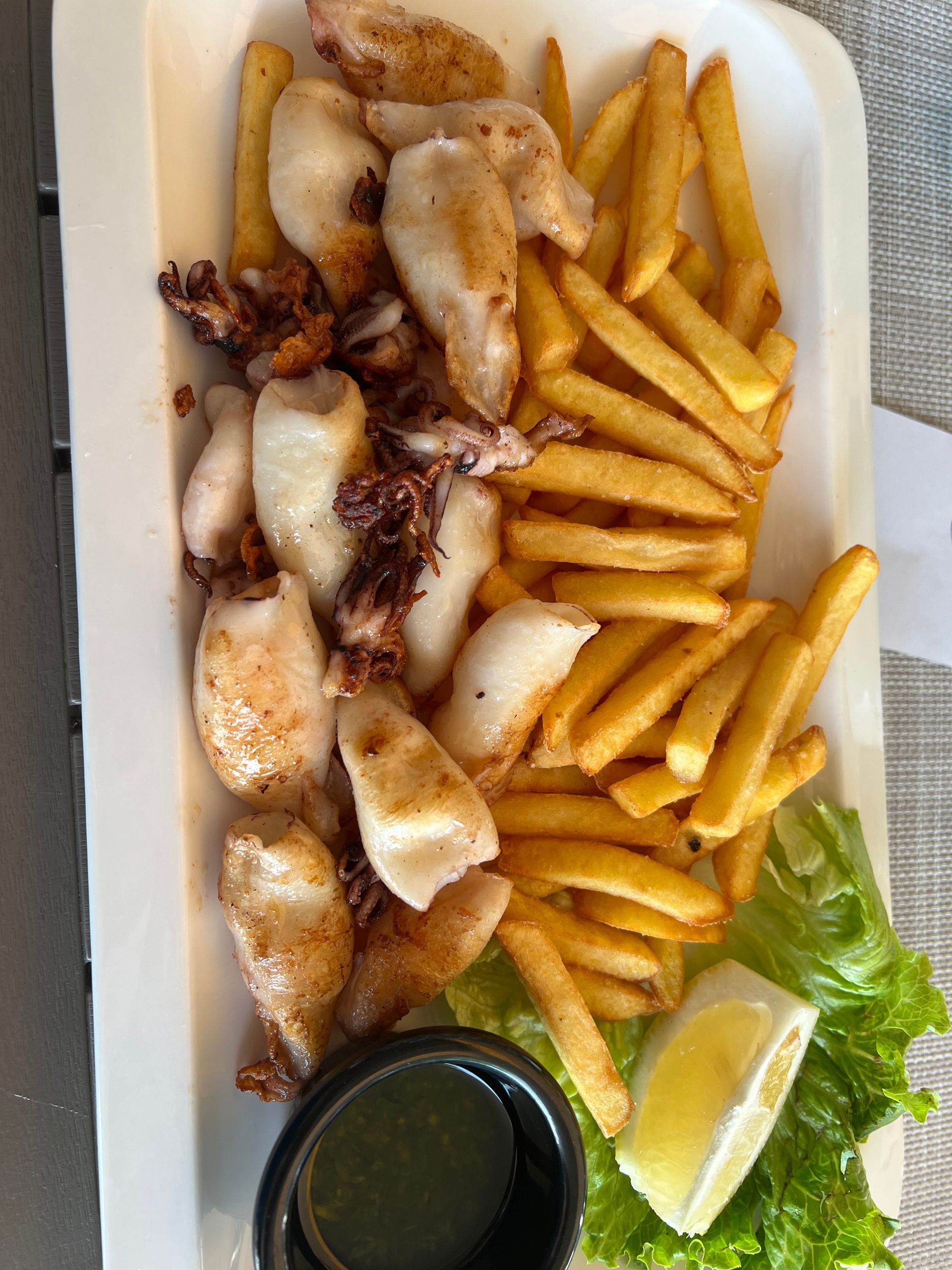Nachdem das erledigt war, mussten wir nochmal Pause machen und uns überlegen, wann und wo wir Nachmittags/Abends essen wollen. Wir haben uns dann für eine Strandbar in der Nähe entschieden, wenig auf der Karte, aber jeder bekommt was. Hauswein, Calamari, frittierte Fischfilets und Kartoffelecken, gutes Essen kann so so einfach sein!!!!!