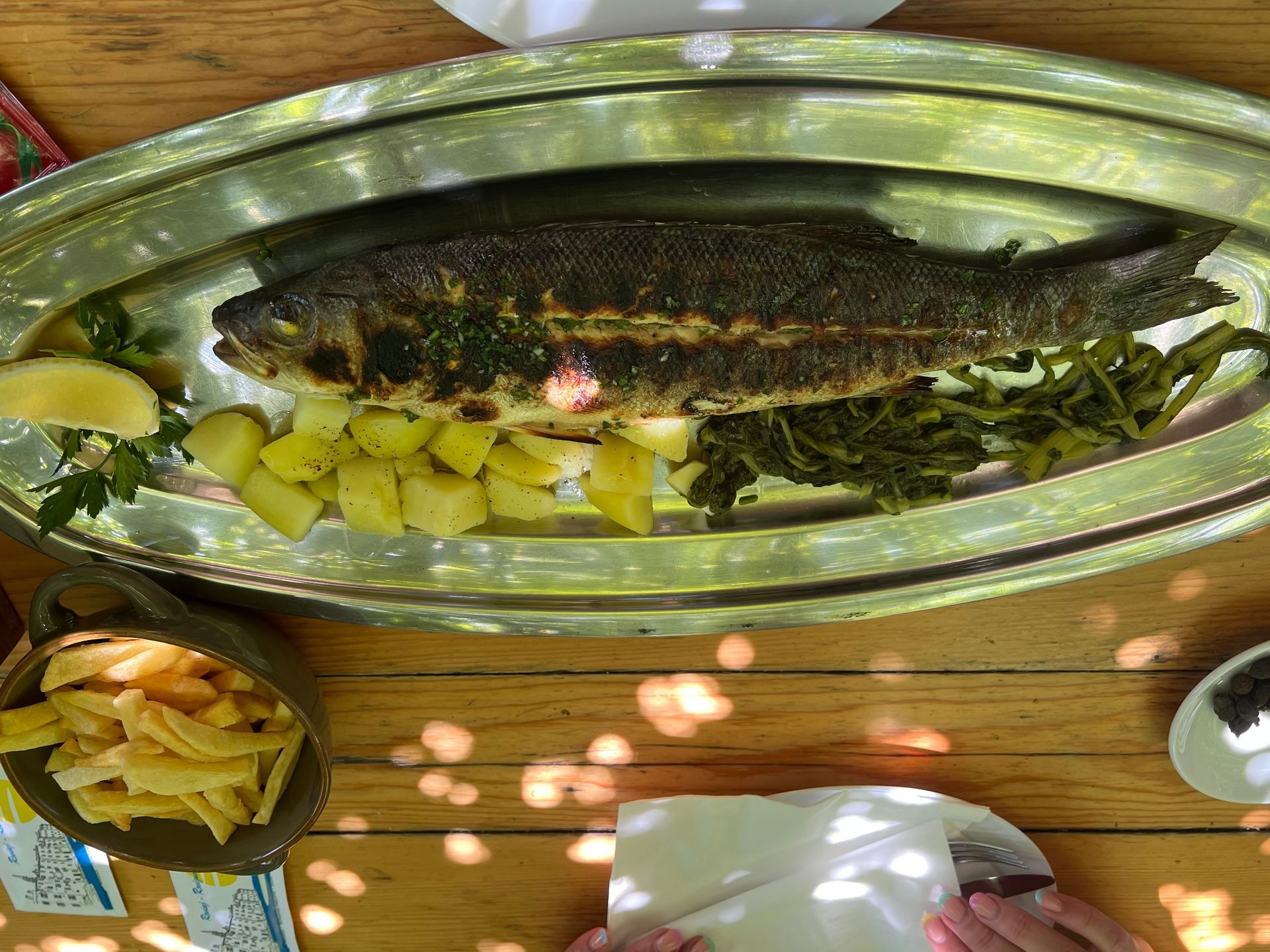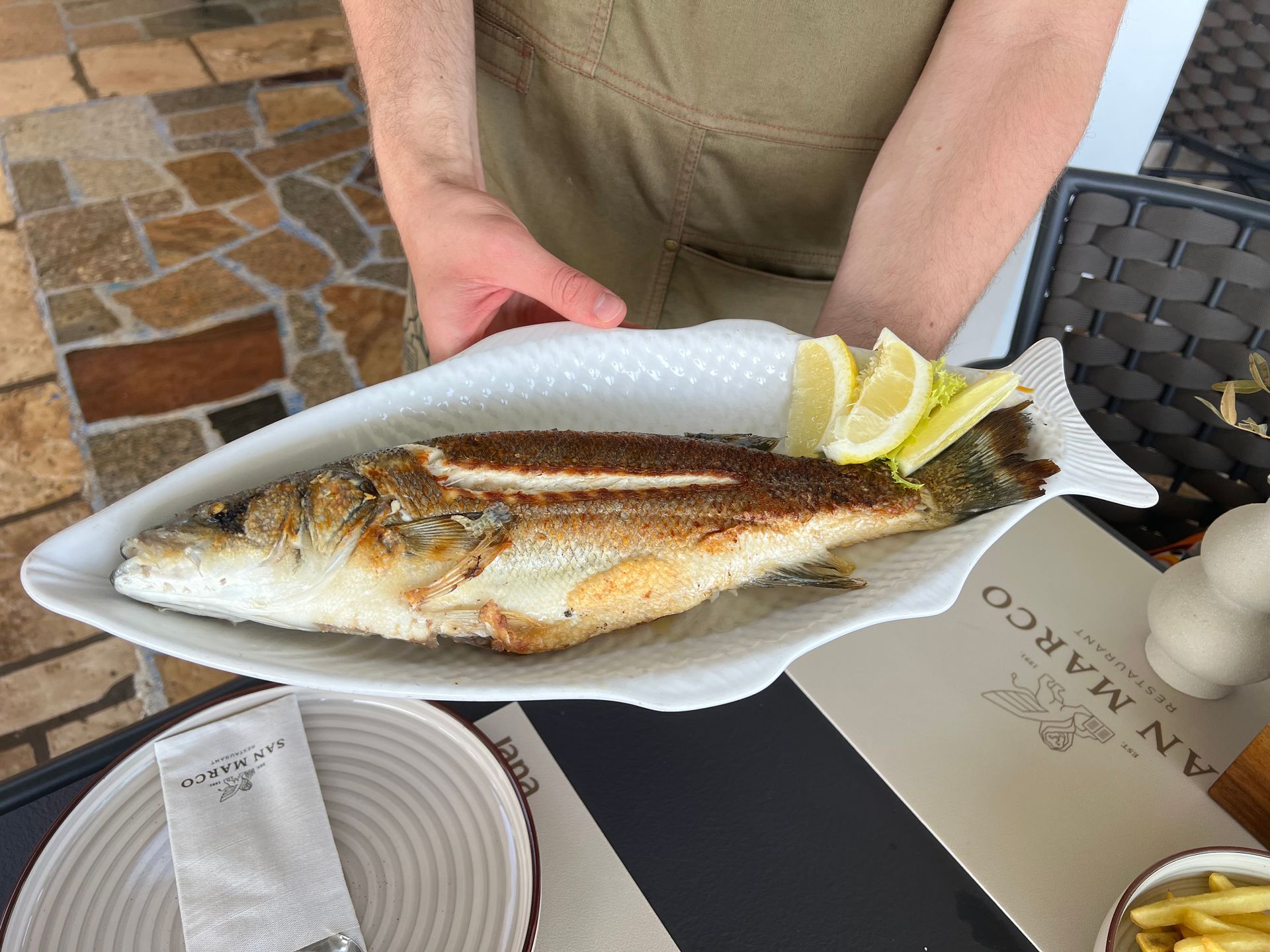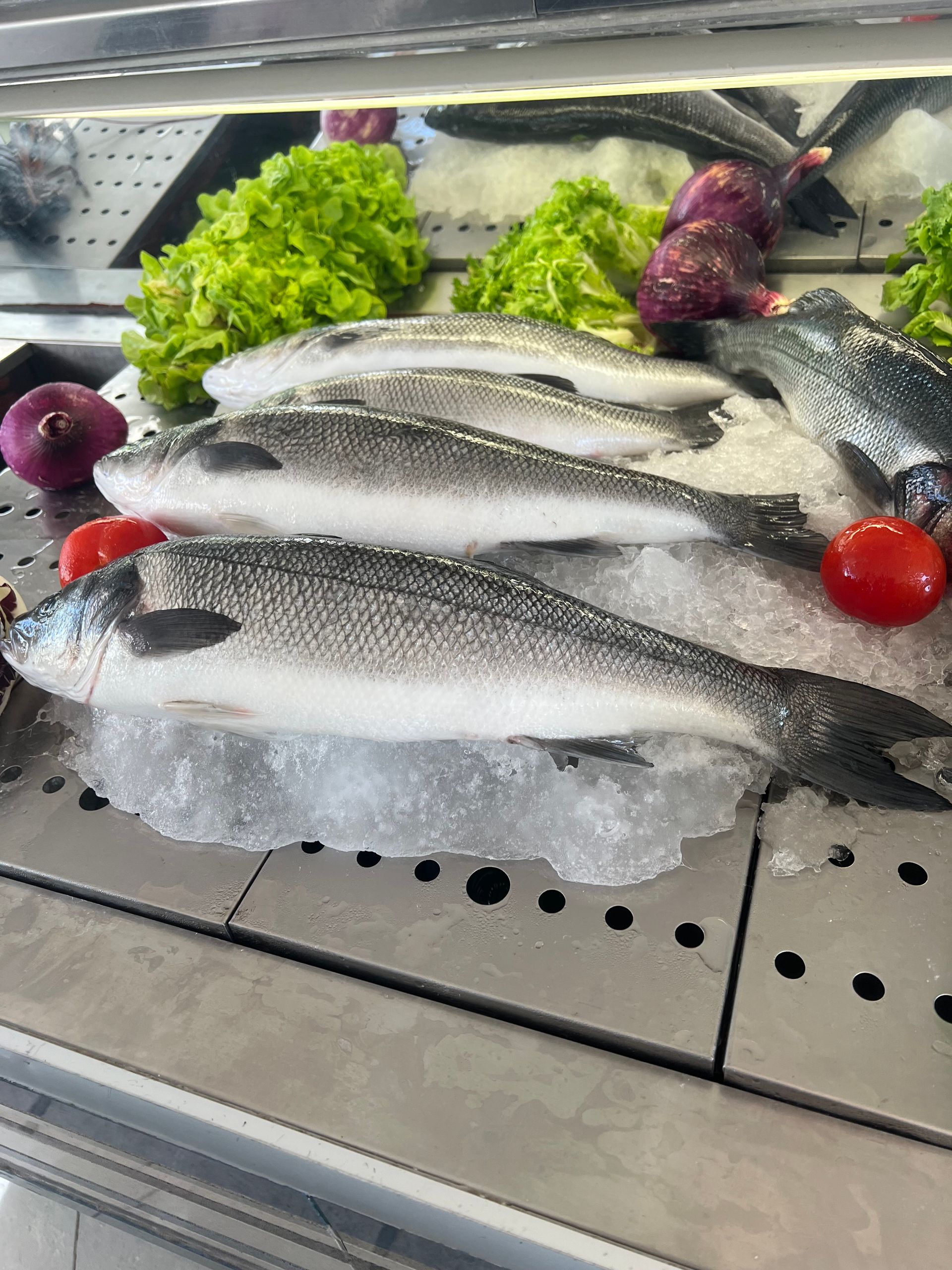 Als wir dann den bekannten Weg nach Umag genommen haben, ist uns aufgefallen, dass trotz Sonntag kaum Menschen an den Stränden waren und auch in Umag war tote Hose. Wir sind dann in ein sehr nettes Restaurant mit einer Bewertung von 4,8 gegangen und waren die einzigen Gäste, Wir saßen direkt am Wasser, konnten uns den Fisch, den wir uns teilen wollten aussuchen und haben dazu lecker Malvisia getrunken. Die Bilder sprechen hoffentlich für sich, die Fische heute morgen gefangen, frischer geht kaum. Das Essen war sehr lecker und bis auf die Gräten ist auch nichts übrig geblieben. Danach gab es noch einen Schnaps aufs Haus und wir hatten ein super Essen für etwa 60 € ohne Trinkgeld.