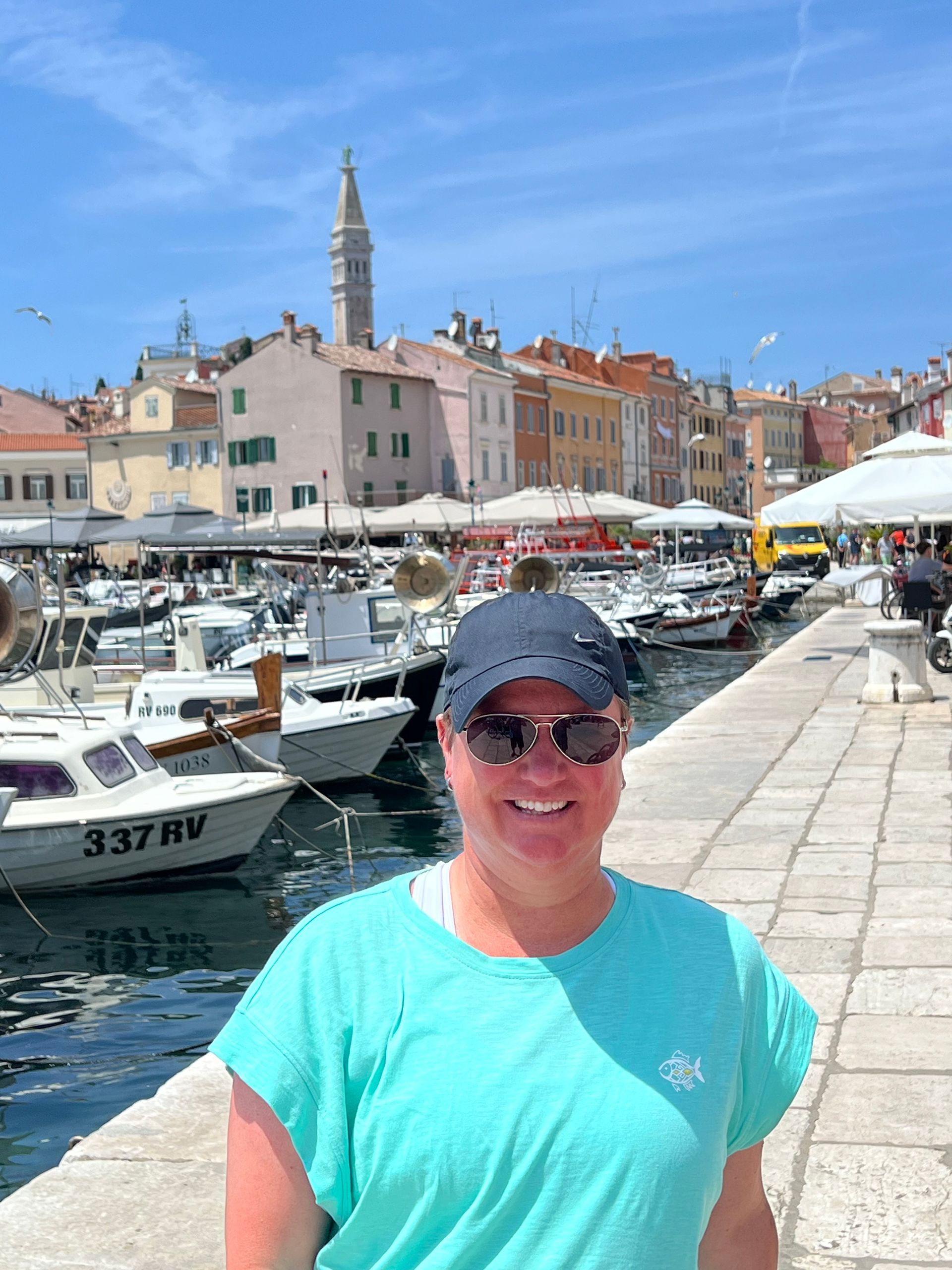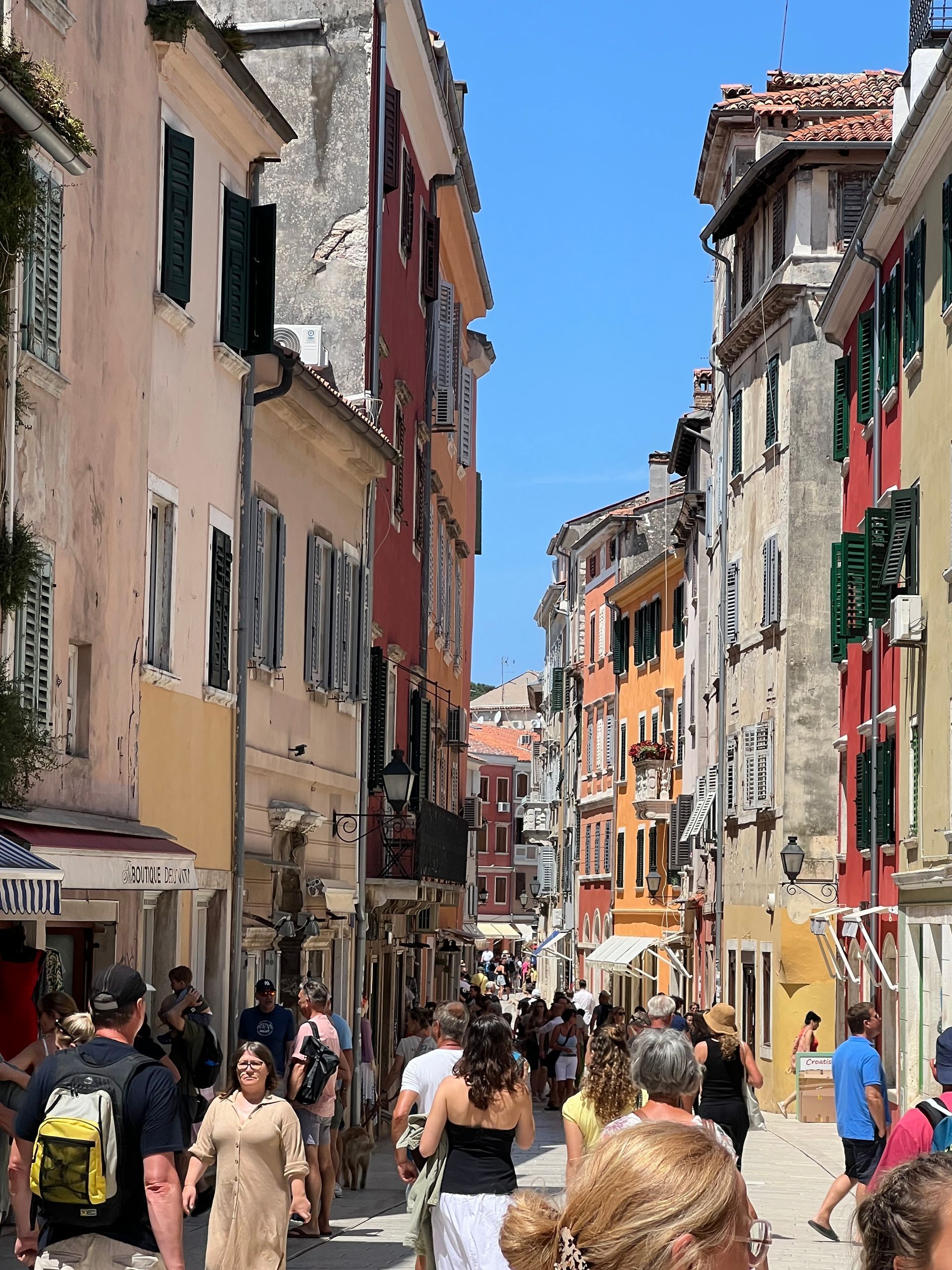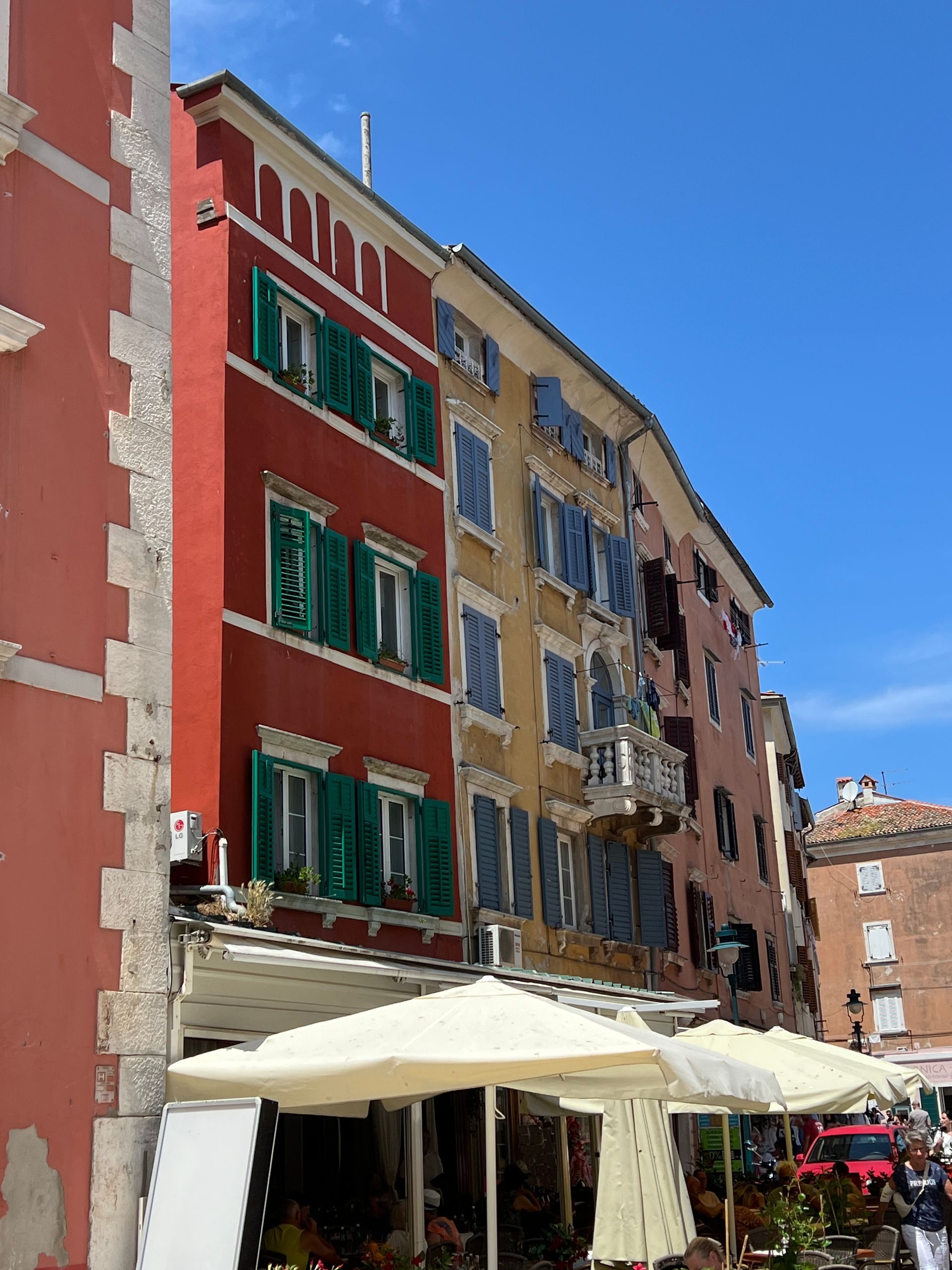 Wir haben dann erst einmal mögliche Schäden untersucht, aber außer einer dreckigen Matte vor der Dotti und viel Wasser im Boot war alles ok ;-) Juliane war schon früh schwimmen und hat die Ruhe im Meer genossen. Wir sind dann nach einem Frühstück die 10 km nach Rovinj gefahren. Außer einem kleinen Orientierungsproblem am Anfang nach einem Kilometer meinerseits lief alles wie geschmiert. Wir mussten an mehreren umgekippten Bäumen vorbeifahren und vielen abgeknickten Ästen ausweichen, aber den Weg nach Rovinj haben wir gefunden. Es war deutlich voller in der Stadt, als 2023 und 2024 im September, aber immer noch erträglich. Nur die Hitze war schon recht heftig, sodass wir in unseren Bar, siehe letzten Samstag einen Drink genommen haben.