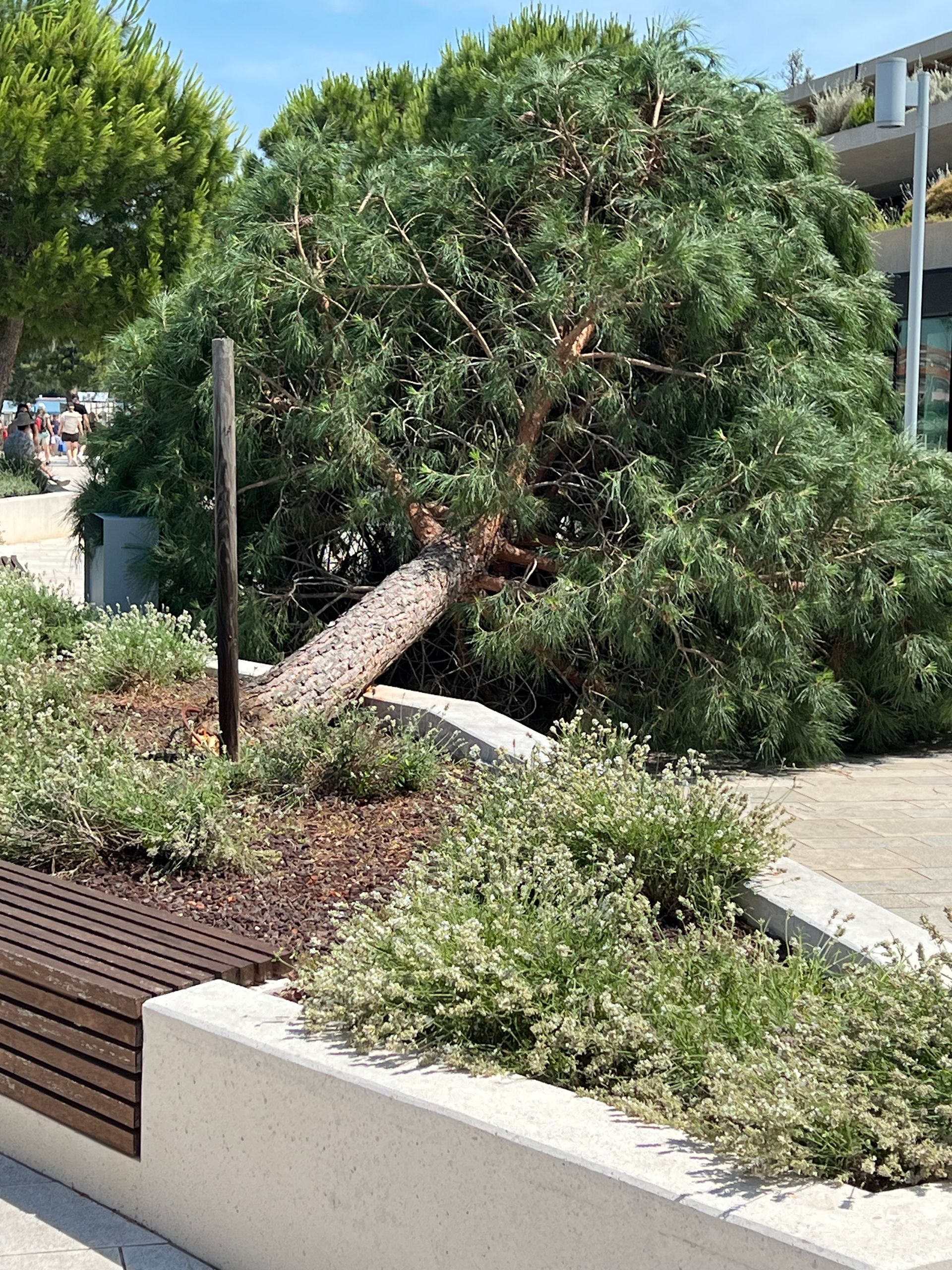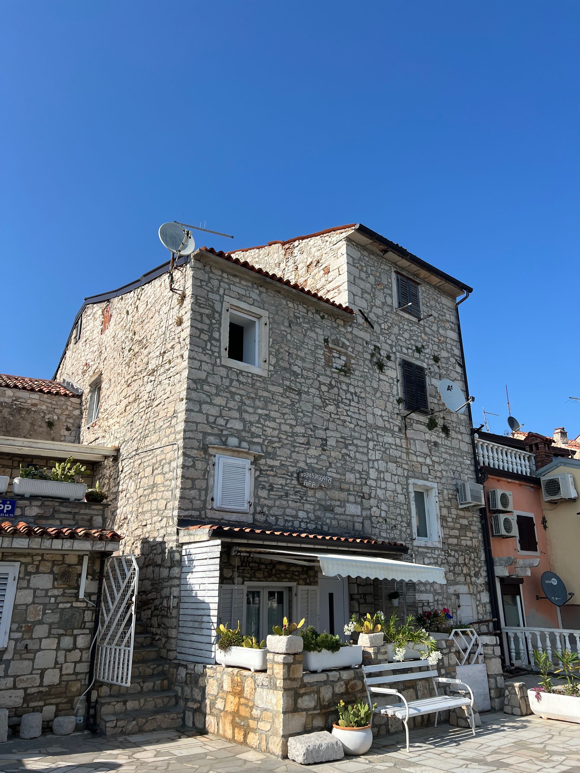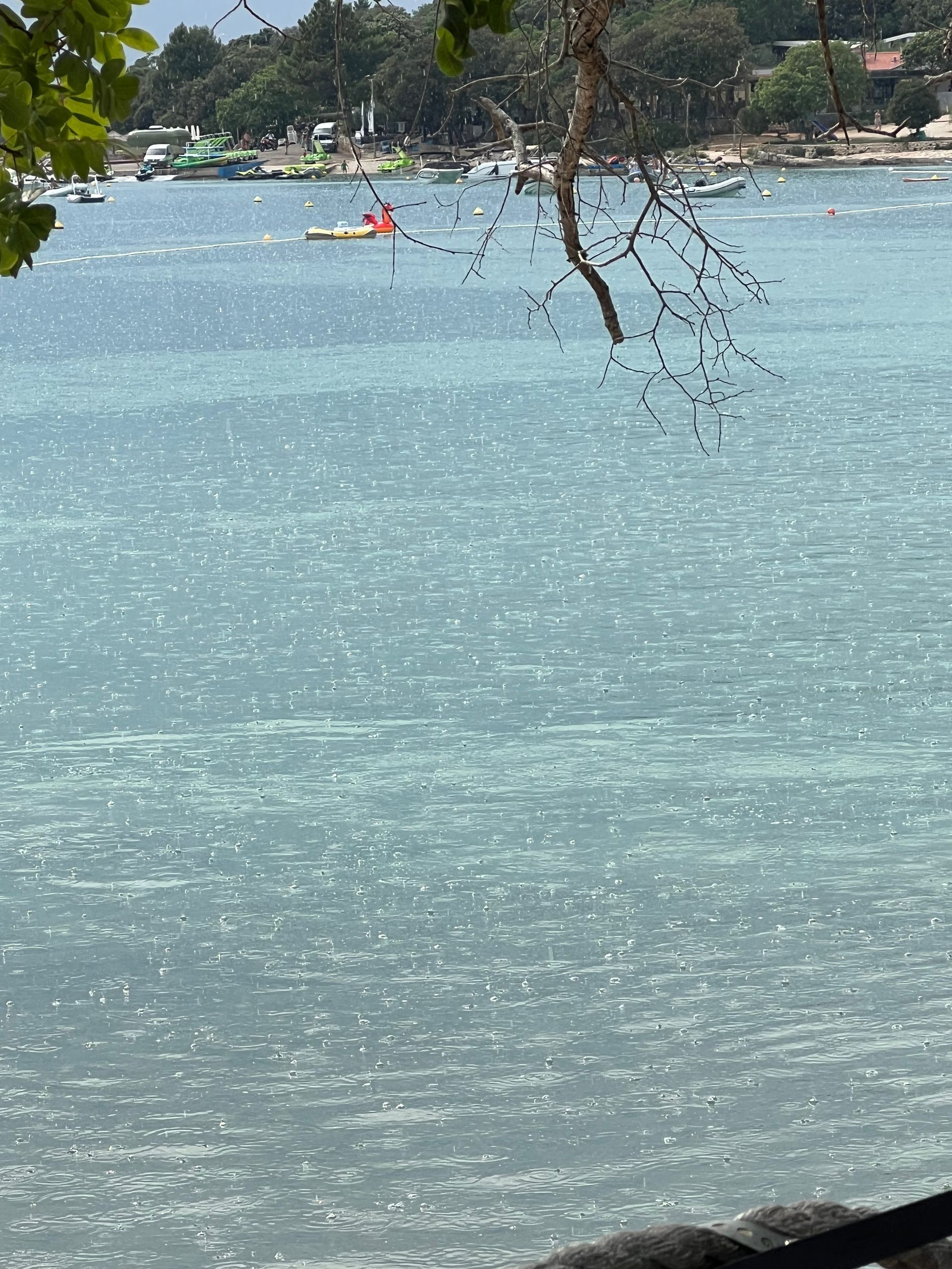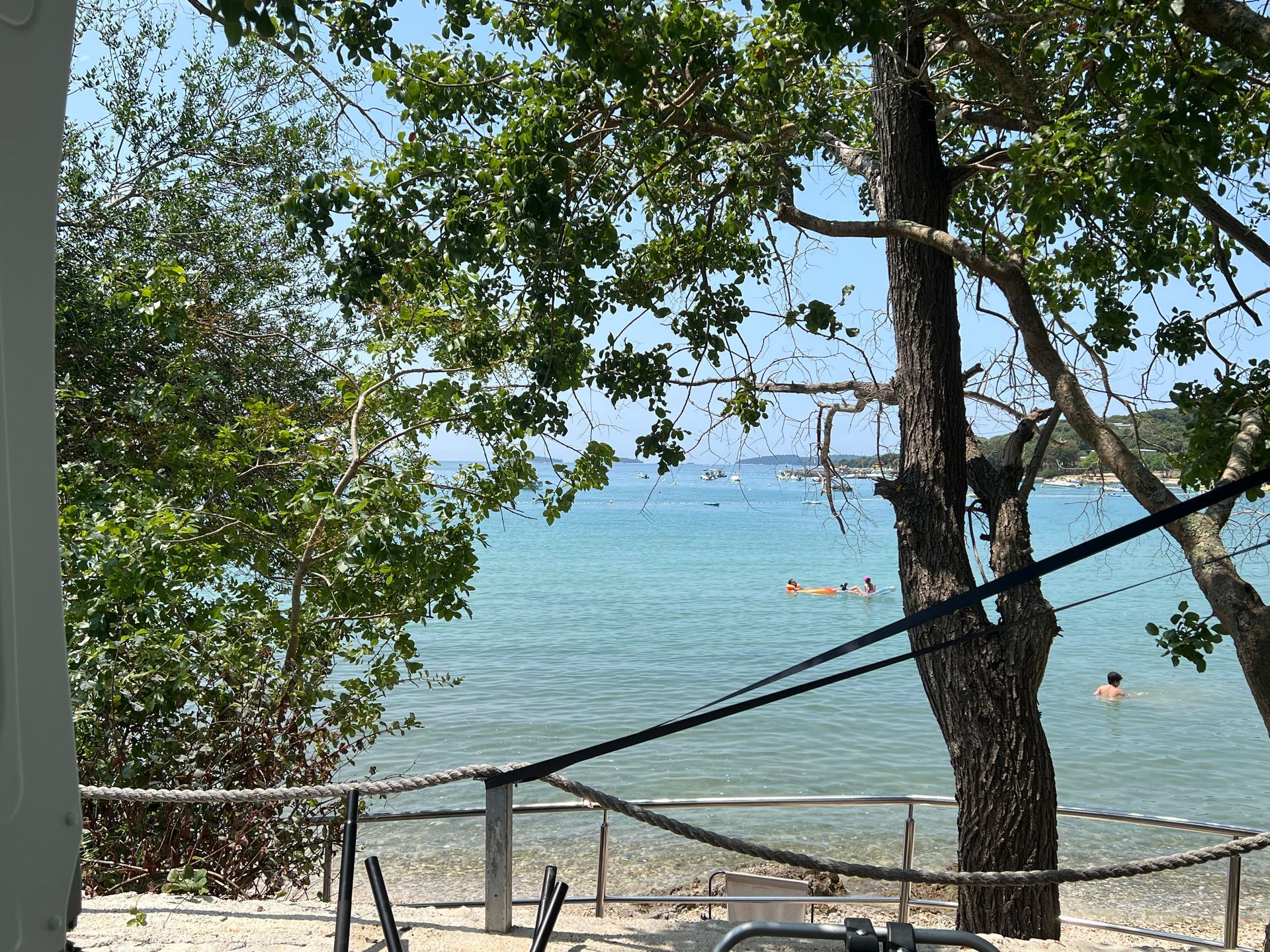 Wir haben dann erst einmal mögliche Schäden untersucht, aber außer einer dreckigen Matte vor der Dotti und viel Wasser im Boot war alles ok ;-) Juliane war schon früh schwimmen und hat die Ruhe im Meer genossen. Wir sind dann nach einem Frühstück die 10 km nach Rovinj gefahren. Außer einem kleinen Orientierungsproblem am Anfang nach einem Kilometer meinerseits lief alles wie geschmiert. Wir mussten an mehreren umgekippten Bäumen vorbeifahren und vielen abgeknickten Ästen ausweichen, aber den Weg nach Rovinj haben wir gefunden. Es war deutlich voller in der Stadt, als 2023 und 2024 im September, aber immer noch erträglich. Nur die Hitze war schon recht heftig, sodass wir in unseren Bar, siehe letzten Samstag einen Drink genommen haben.