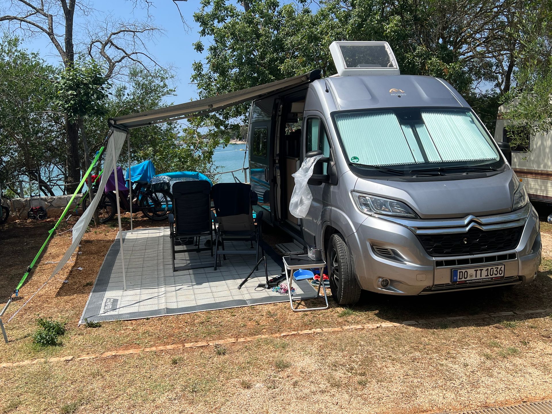 Der Einkauf war die Hölle, am Ende 6 Kassen auf und ein Gedränge zwischen den Regalen. Am Schlimmsten waren unsere Landsleute! Da geht eine 6-köpfige Familie gemeinsam einkaufen und alle stehen immer nur im Weg. Egal, wir haben bekommen was wir wollten und sind weiter zum Campingplatz Finida gefahren. Der Mann an der Rezeption war sehr nett und hat uns unseren Stellpatz auf der Karte gezeigt. Sah erst einmal gut aus. Also die paar Meter zum Platz gegangen. Schön in zweiter Reihe, aber mitten auf dem Platz ein Gullideckel, ca. 30 cm tiefer als der Rest des Platzes. Das kann ich auch mit unseren Keilen nicht abfangen! Also zurück zur Rezeption und gesagt das das nicht funktioniert. Wir haben jetzt einen viel besseren Platz, ein paar Reihen weiter vom Meer, aber immer noch Meerblick durch die Bäume ;-)