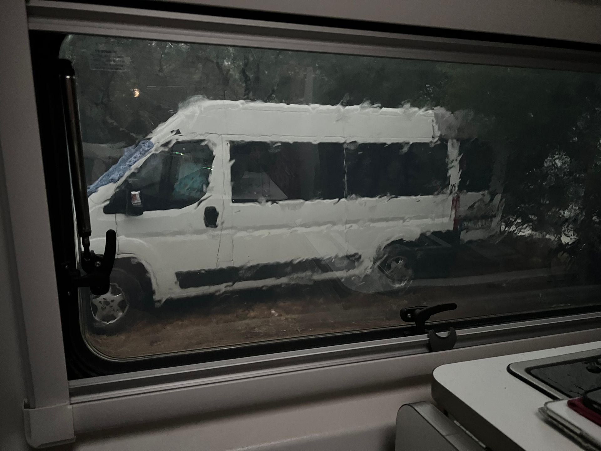 Wir haben sehr lecker gegessen und einen schönen Malvasia getrunken, aber dann wurde es plötzlich richtig dunkel. Also schnell bezahlt und die 300 Meter zurück zum Platz. Es war schon sehr stürmisch rote „Baywatch-Badehose“ war schon weggeflogen. Schnell alles eingepackt, die Nachbarn waren natürlich auch alle in Aufregung und wir haben alles ohne Schäden eingefahren (Sonnenschutz und Markise) eingepackt und verstaut (Stühle und Wäsche). Wir sitzen jetzt in der Dotti und lassen den Abend über uns ergehen. Morgen wird alles wieder gut, wir können alles trocknen lassen und den Sonnenschutz wieder ausfahren.
