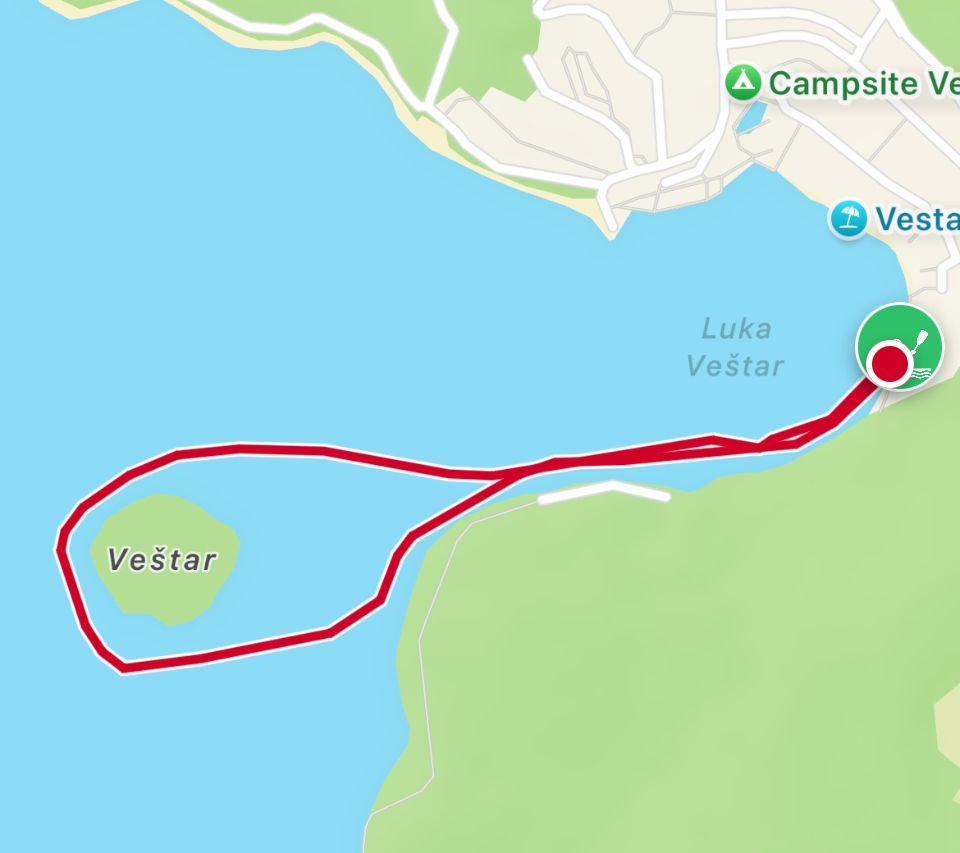 Heute haben wir wieder super geschlafen, es gab ja auch keinen Sturm und kein Gewitter. Den Vormittag haben wir mit Schwimmen und an der Dotti verbracht. Gegen 13 h sind wir zur Konoba Mofardin zu fahren, ein Agritourismo mit dem Motto „nema stressa“, so waren die auch drauf, aber Essen und der Wein waren Klasse. Danach zurück zur Dotti und uns vom Essen erholt, dann nochmal schwimmen gegangen und das Kajak gesäubert und eine Runde von knapp über 2 Km (das ist das Bild um die kleine Insel) gefahren.