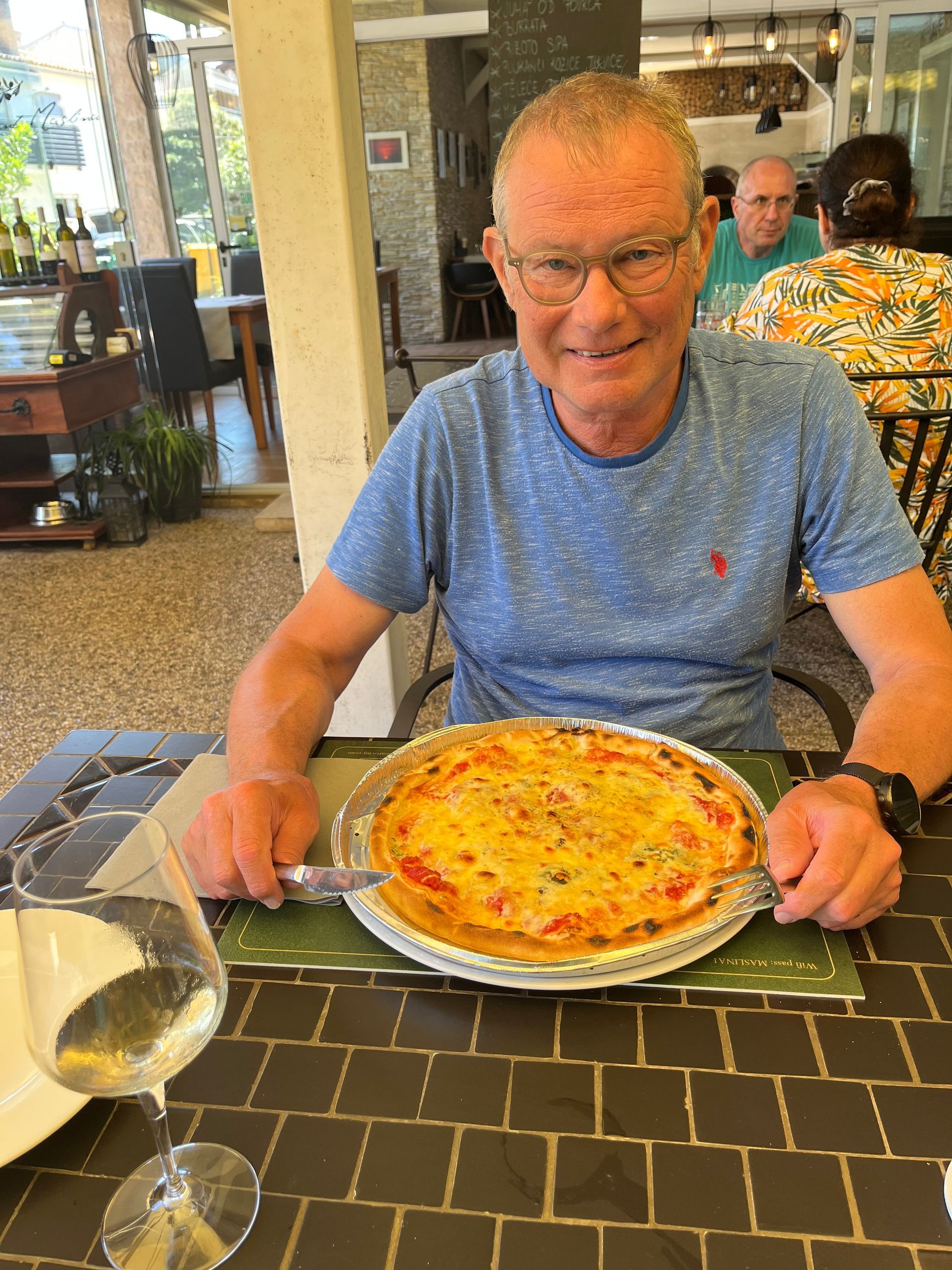 Wir haben morgens noch ein wenig rumgegammelt, haben vom Bett aus aufs Meer geschaut und haben Kaffee getrunken. Gegen Mittag, nachdem wir schon einmal das Kajak eingepackt haben, sind wir dann Richtung Rovinj mit dem Rad aufgebrochen. Es war schon extrem warm und wir waren froh die E-Bikes zu haben.Das Restaurant sollte glutenfreie Nudeln und Pizza haben und ich hatte mal wieder Appetit auf Pizza. Der Kellner war sehr nett und aufmerksam und die beiden Pizzen echt klasse. Bei meiner ist was übrig geblieben, das gibt es gleich noch als Pfannenpizza.